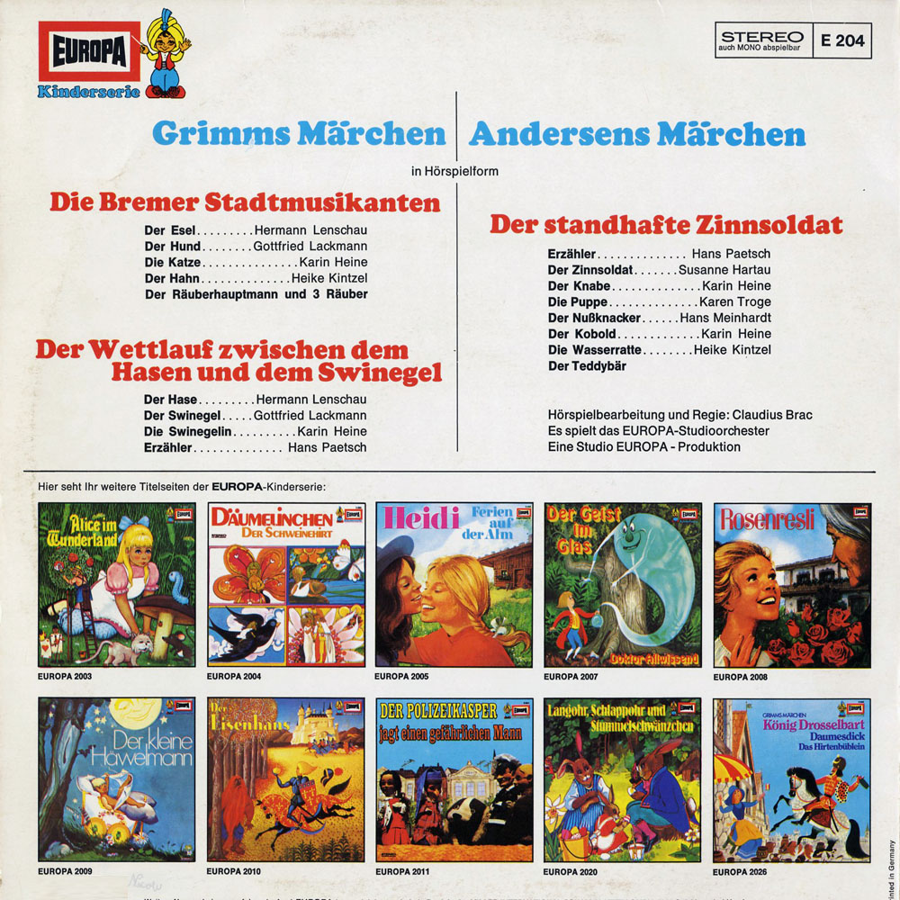 Und die Schallplatte war ein fester,nicht wegzudenkender Bestandteil meiner Kindheit.Rauf und runter hörte ich die Geschichten vom Zinnsoldaten,dem Hasen und dem Igel und natürlich die der Stadtmusikanten.