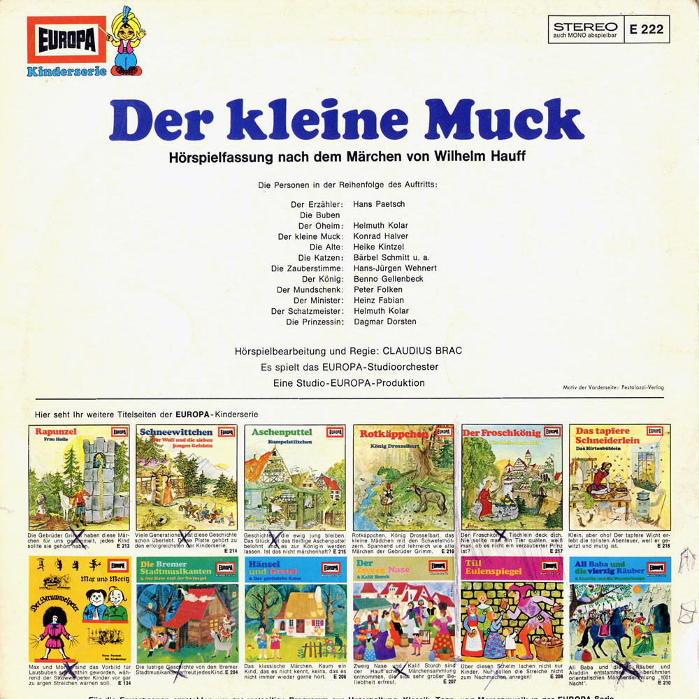 Auch ich habe diese Platte als Kind sehr oft gehört, aber irgendwann mochte ich sie gar nicht mehr, weil ich die Geschichte plötzlich zu traurig fand. Es macht einem schon das Herz schwer, mitanzuhören, welche Schicksalsschläge der kleine Muck erleiden muss. Das fröhliche Cover passt daher eigentlich gar nicht zur Grundstimmung des Hörspiels.