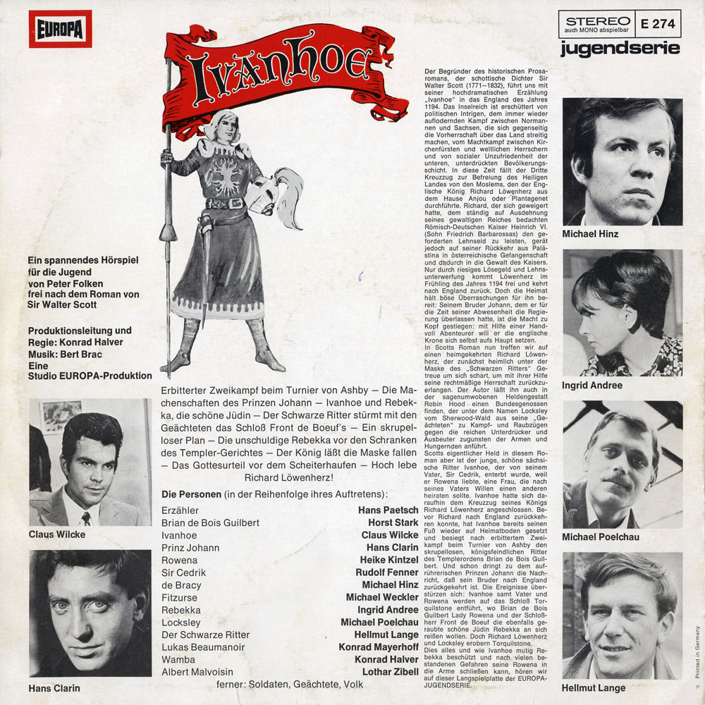 Erbitterter Zweikampf beim Turnier von Ashby – Die Machenschaften des Prinzen Johann – Ivanhoe und Rebekka, die schöne Jüdin – Der Schwarze Ritter stürmt mit den Geächteten das Schloß Front de Boeufs – Ein skrupelloser Plan – Die unschuldige Rebekka vor den Schranken des Templer-Gerichtes – Der König läßt die Maske fallen – Das Gottesurteil vor dem Scheiterhaufen – Hoch lebe Richard Löwenherz!