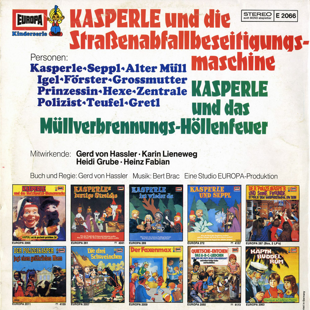 Sowas schräges ist mir nie wieder untergekommen.Aber das war Kasper-Kinder-Unterhaltung der 70'er.Der Europa-Kasper war damals für mich der Inbegriff des Kaspers.Mehrfachrollen und Textfehler haben mich dabei nie gestört.Insgesamt betrachtet erscheint die LP heute etwas nerviger als früher,die Geschichten sind aber immer noch hörenswert und schön gemacht.