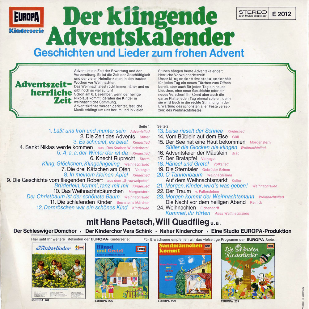 Laßt uns froh und munter sein – Die Zeit des Advents – Es schneiet, es beiet – Sankt Niklas werde kommen – A, a, a, der Winter, der ist da – Knecht Ruprecht – Kling, Glöckchen, klingelingeling – Die drei Kätzchen am Ofen – In meinem kleinen Apfel – Die Geschichte vom fliegenden Robert – Brüderlein, komm' tanz' mit mir – Das Weihnachtsbäumchen – Der Christbaum ist der schönste Baum – Die schlafenden Kinder – Dornröschen war ein schönes Kind – Leise rieselt der Schnee – Vom Büblein auf dem Eise – Der See hat eine Haut bekommen – Süßer die Glocken nie klingen – Die Adventsfeier der Mäuslein – Der Bratapfel – Hänsel und Gretel – Die Sterntaler – O Tannenbaum – Auf dem Weihnachtsmarkt – Morgen, Kinder, wird?s was geben – Der Traum – Morgen kommt der Weihnachtsmann – Die Nacht vor dem heiligen Abend – Weihnachten – Kommet, ihr Hirten