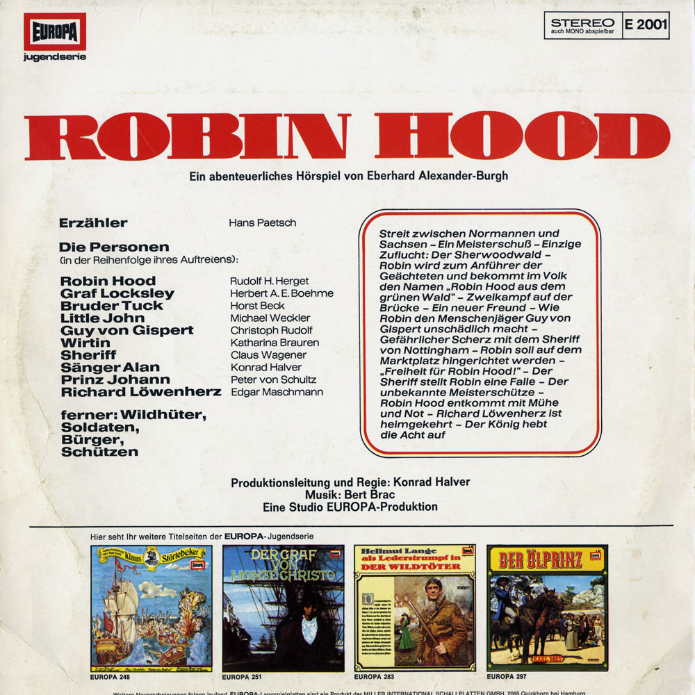 Streit zwischen Normannen und Sachsen – Ein Meisterschuß – Einzige Zuflucht: der Sherwoodwald – Robin wird zum Anführer der Geächteten und bekommt im Volk den Namen "Robin Hood aus dem grünen Wald" – Zweikampf auf der Brücke – Ein neuer Freund – Wie Robin den Menschenjäger Guy von Gispert unschädlich macht – Gefährlicher Scherz mit dem Sheriff von Nottingham – Robin soll auf dem Marktplatz hingerichtet werden – "Freiheit für Robin Hood!" – Der Sheriff stellt Robin eine Falle – Der unbekannte Meisterschütze – Robin Hood entkommt mit Mühe und Not – Richard Löwenherz ist heimgekehrt – Der König hebt die Acht auf