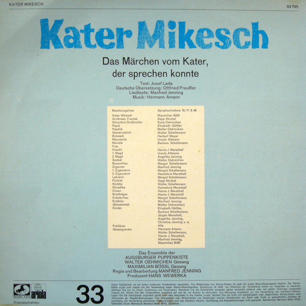 Oh, diese Platte ist ganz toll. Da kommt noch voll das Flair der alten Augsburger Puppenkiste rüber. Alle Puppenspieler rollen ihr bayerisches "R" und die Margot Schellemann mit ihrer tollen Lache ist eh der Knaller. Die Neuauflage des Kater Mikesch ist dagegn viel zu glatt und langweilig political correct - genau wie die Neusynchronisationen der Disneyfilme, aber das ist wieder ein anderes trauriges Kapitel.