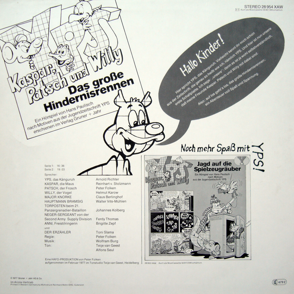 Hallo Kinder! Hier spricht YPS, das Känguruh. Vielleicht kennt ihr mich schon aus der Zeitschrift, die genauso heißt wie ich, nämlich YPS. Und hier ist nun unsere erste Schallplatte. Ich sage: "unsere", denn es ist ja wohl selbstverständlich, daß meine Freunde Kaspar, Patsch und Willy mit dabei sind. Also: auf los geht's los, das große Hindernisrennen