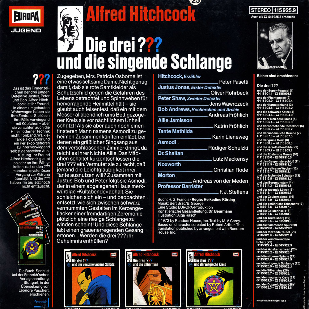 Zugegeben, Mrs. Patricia Osborne ist eine etwas seltsame Dame. Nicht genug damit, dass sie rote Samtkleider als Schutzschild gegen die Gefahren des Lebens betrachtet und Spinnweben für hervorragende Heilmittel hält – sie glaubt auch felsenfest, dass ein mit dem Messer allabendlich um Bett gezogener Kreis sie vor nächtlichem Unheil schützt! Als sie aber auch noch einen finsteren Mann namens Asmodi zu geheimen Zusammenkünften einlädt, bei denen ein grässlicher Singsang aus dem verschlossenen Zimmer dringt, da reicht es ihrer Nichte Allie. Das Mädchen schaltet kurzentschlossen die drei ??? ein. Vermutet sie zu recht, dass jemand die Leichtgläubigkeit ihrer Tante verbrecherisch ausnutzen will? Zusammen mit Justus, Bob und Peter folgt sie Asmodi, der in einem abgelegenen Haus merkwürdige Kultabende abhält. Sie schleichen sich ein – und beobachten entsetzt, wie sich zwischen schwarz vermummten Gestalten im Kerzengeflacker einer fremdartigen Zeremonie plötzlich eine riesige Schlange zu winden scheint! Und diese Schlange lässt einen grausigen Gesang ertönen... Werden die drei ??? ihr Geheimnis enthüllen?