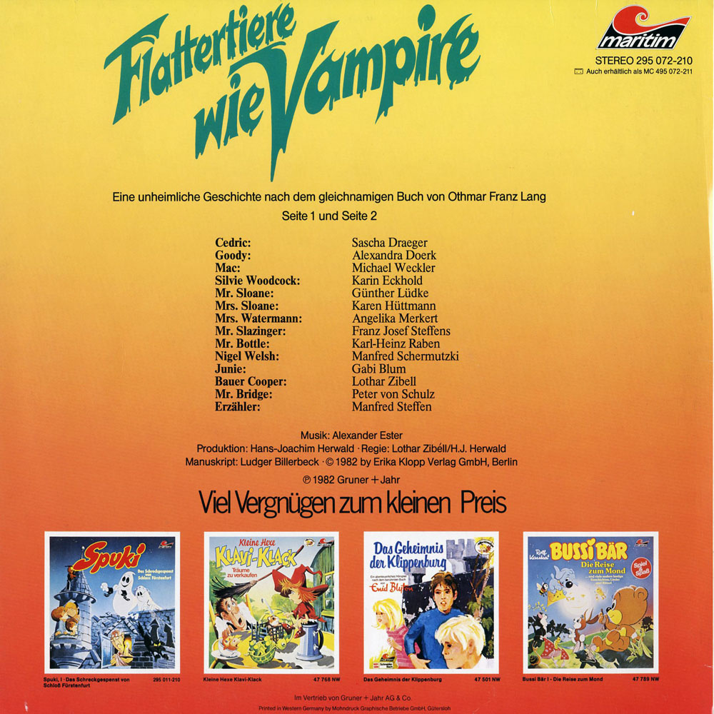 Gestern habe ich mir dieses Hörspiel auch zu Gemüte geführt. Ich war saumäßig entäuscht, obwohl Sascha Dreager eine gute Stimme hatte. Ist wohl eine Erziehung zum Ökodenken, diese MC. 1982 kamen ja auch die Grünen in den Bundestag. Dann gefallen mir die Pizza Bande Hörspiele besser, wenn es um Öko-Kriminalität geht. Die "Vampire" sollen wohl Vampirfledermäuse darstellen, die aber Milch, Strom (wohl aus Kernkraftwerken), Alkokol (um Alkoholismus zu bekämpfen) als Tierblut zu trinken. Wenn der Cedric auch noch selbst Strom erzeugt (äh er ist jetzt zauberhaft öko-alternativ dank Zauberkraft) dann denke ich an das Gutmenschbild der Grünen und Jippi als an Gruner und Jahr.