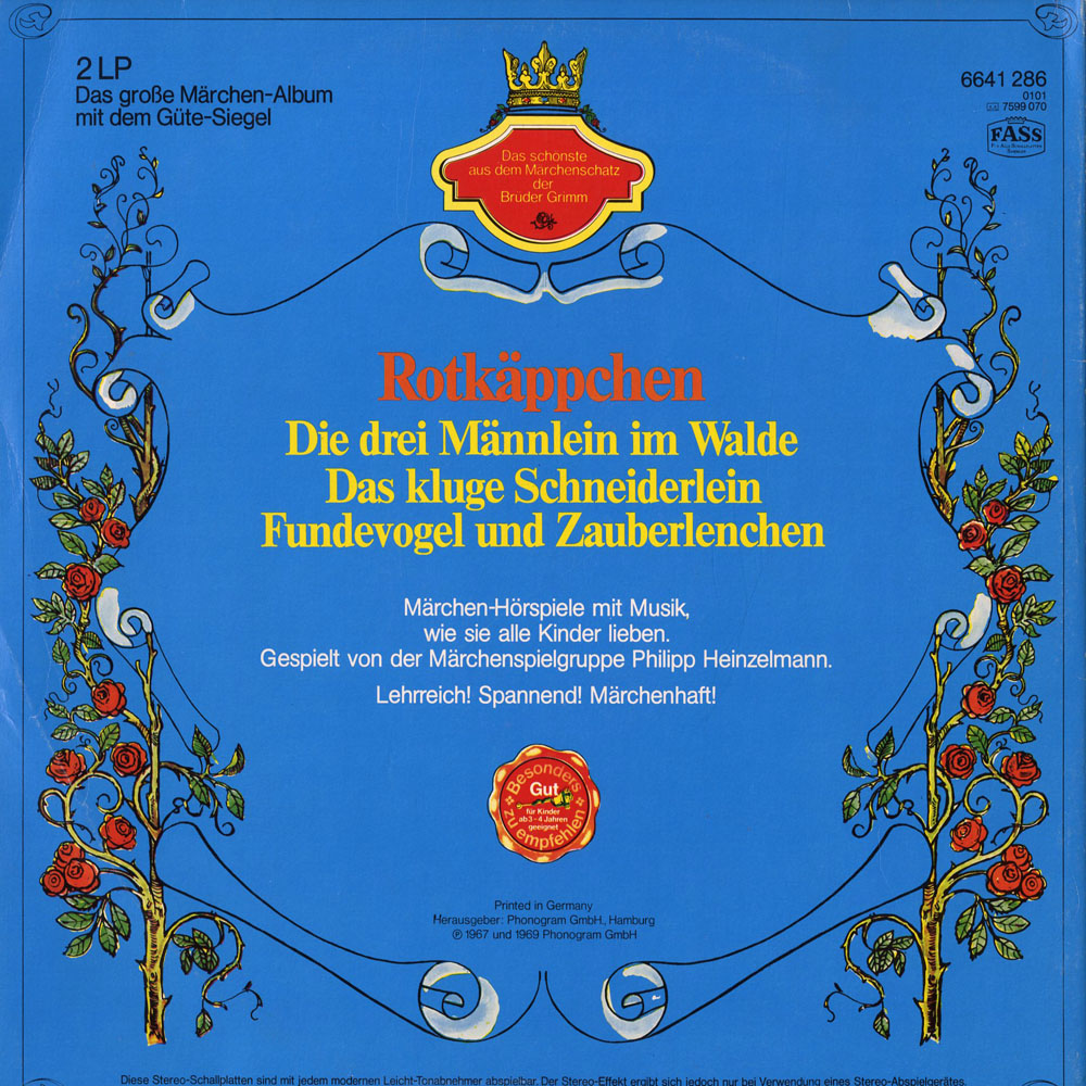 Märchenhörspiele mit Musik von Philipp Heinzelmann nach den Märchen der Gebrüder Grimm Trick- und Geräuscheffekte: Barth Bartholomae Musik und Lieder: Cherry Maryland mit Till Spielmanns-Märchen-Musikanten Hüllengestaltung: Effel-Team / Rainer zu Fall Idee und Cover-Design: 1975 by e.l.f.