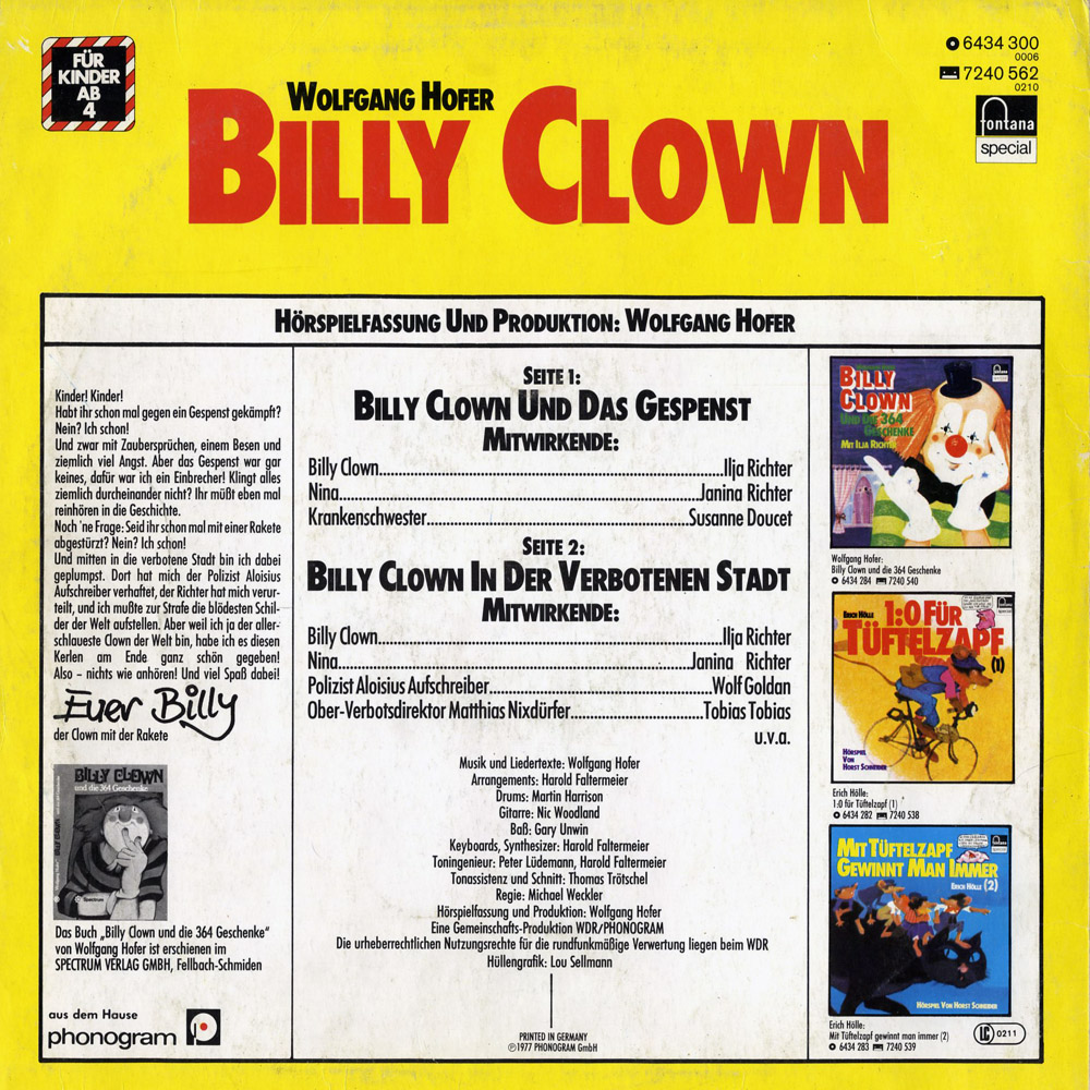 Das habe ich ja gar nicht gewusst, dass es diese Hörspiele auch auf Schallplatte gegeben hat. Ich kannte sie nur aus dem Radio: Der WDR brachte sie 1977 im Kinderfunk. Wenn ich mir so die Besetzungsliste ansehe, finde ich einige bekannte Namen: Ilja Richter als Hauptdarsteller war mir ja schon bekannt, Janina Richter (wahrscheinlich seine Schwester) ist mir nicht aufgefallen. Dass die Musik von Wolfgang Hofer stammt - dem "Trödler Abraham" - ist durchaus beachtenswert. Ein Wunder, dass der bei dieser Veranstaltung nicht auch eine Sprechrolle abbekommen hat'''