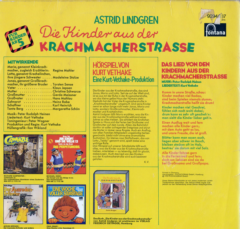 Komm in unsere Strasse und schau Kinder machen hier Radau ! Prima Platte, die aber nicht ganz an meinen Favoriten 'Lotta zieht um' herankommt. Was wäre Fontana ohne Jepsen und Schiff ? Ok, was wäre EUROPA ohne Paetsch...
