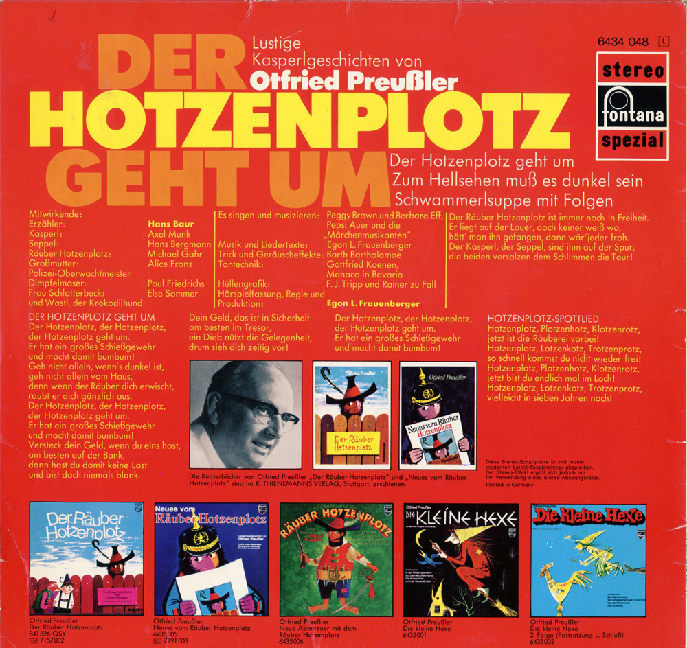 Die ersten vier Hotzenplotz-Platten: Meine ersten Hörspiele. Einfach nur wunderschön. Verstärkt wurde der Eindruck dann 1973oder74 durch einen Kinobesuch im Film mit Gerd Fröbe.