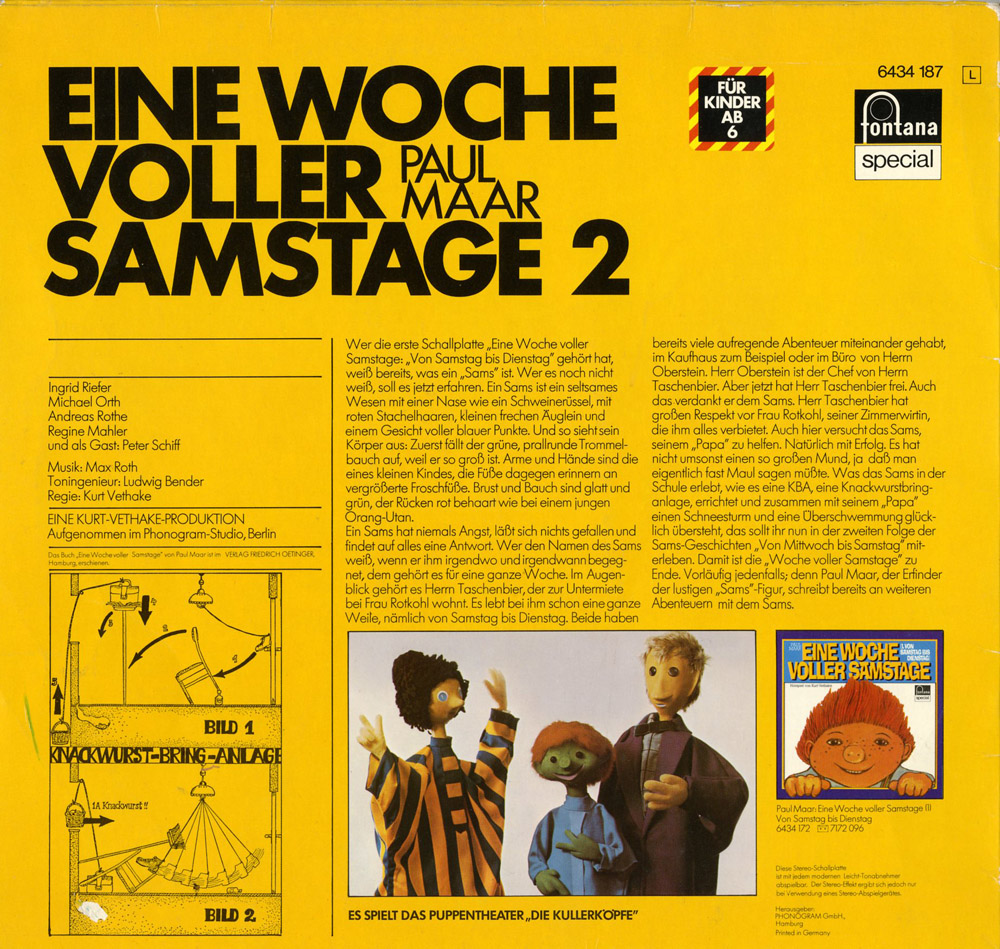 Wer die erste Schallplatte "Eine Woche voller Samstage" gehört hat, weiß bereits, was ein "Sams" ist. Wer es noch nicht weiß, soll es jetzt erfahren. Ein Sams ist ein seltsames Wesen mit einer Nase wie ein Schweinerüssel, mit roten Stachelhaaren, kleinen frechen Äuglein und einem Gesicht voller blauer Punkte. Und so sieht sein Körper aus: Zuerst fällt der grüne, prallrunde Trommelbauch auf, weil er so groß ist. Arme und Hände sind die eines kleinen Kindes, die Füße dagegen erinnern an vergrößerte Froschfüße. Brust und Bauch sind glatt und grün, der Rücken rot behaart wie bei einem jungen Orang-Utan.