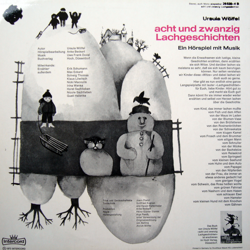 Wenn die Erwachsenen sich lustige, kleine Geschichten erzählen, dann erzählen sie sich Witze. Und darüber lachen sie meistens so sehr, daß sie sich kaum beruhigen können. Nur selten verstehen wir Kinder diese »Witze« und dabei lachen wir doch auch so gerne. Hier gibt es nun endlich eine ganze Langspielplatte mit lauter »Lachgeschichten« für Euch, liebe Kinder. Hört gut zu und merkt sie Euch gut! Dann könnt Ihr sie immer wieder weiter erzählen und selbst von Herzen lachen über die Geschichte: vom Kind, das immer lachen mußte vom Floh und dem Affen von der Maus im Laden von der Blumen-Vase von den Brüllstieren von den Rosinenbrötchen von der Schneekatze vom klugen Kamel vom Frosch und dem Brummer vom eiligen Mann vom Schnuller von der Mücke von der Bachstelze vom Reisekind vom Springseil vom kleinen Seehund vom Huhn und dem Auto vom Papagei von den Nilpferden von der Frau, die immer an etwas anderes gedacht hat vom gierigen Vogel vom Schwein, das Rosa heißen wollte vom grünen Fahrrad vom Nashorn und dem Hasen vom schlauen Esel vom Hamster vom kleinen Hund mit dem Knochen vom Gähnen