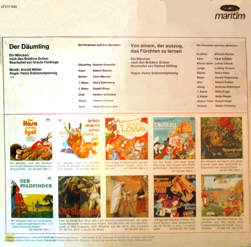 Eine schöne Märchenplatte. "Der Däumling" gefiel mir hier stets besser als in der EUROPA-Fassung (auch wenn beide Fassungen sich sehr ähnlich sind). Empfehlenswert ist die LP aber vor allem wegen der B-Seite: "Von einem, der auszog..." ist klasse umgesetzt. Ludwig Thiesen in der Hauptrolle ist von den diversen Versuchen, ihn das Fürchten zu lehren, einfach nicht klein zu kriegen. Erst am Schluss schafft es seine Frau Gemahlin - aber wie!