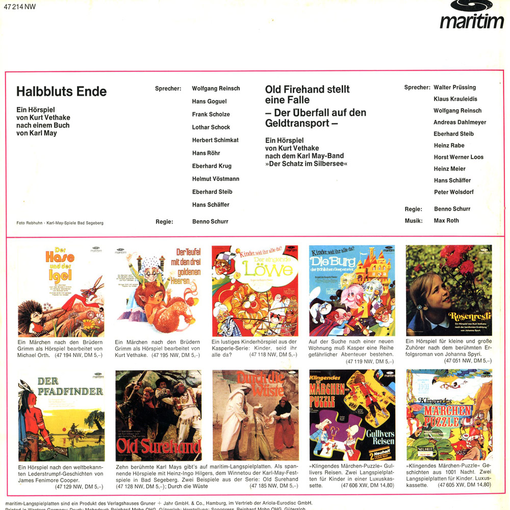 Zu beachten ist, dass Seite A und Seite B ÜBERHAUPT nichts miteinander zu tun haben. Wegen der Kürze des Halbblut-Schlussteils musste wohl noch irgendetwas anderes auf die Kassettenrückseite, und die Wahl fiel tatsächlich auf ein Stück 'Schatz im Silbersee'. Denn die Episode mit dem (falschen) Keller, Mr. Charoy und Col. Brinkley ist bei anderen Hörspielfassungen - u. a. auch bei den EUROPA-Klassikern - in der Tat im 'S. i. S.' zu hören.