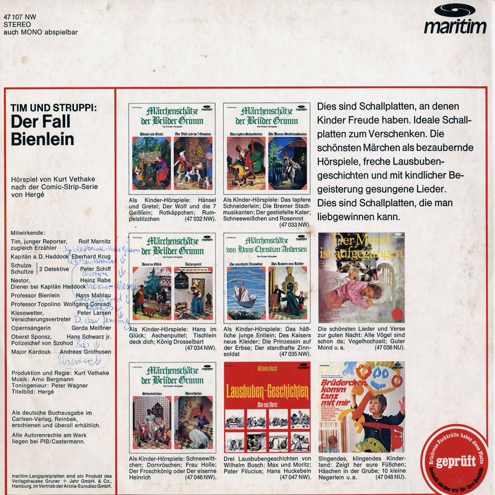 Schöne Umsetzung des Tim & Struppi Comics. Die Hauptrolle ist mit Rolf Marnitz eigentlich etwas zu alt besetzt, läßt sich jedoch im Team mit dem bärenbullenbeissenden Eberhard Krug durchaus vergnüglich hören. Die Bearbeitung folgt dem Text der Vorlage, wobei visuelle Gags entweder zusätzlich erläutert werden oder ganz entfallen. Der Erzähltext beschränkt sich wohltuend auf das Notwendigste. Als kleiner Schwachpunkt erweisen sich indessen Volumen und Montage der Geräuschkulisse. Zum einen sind die Gewitterdonner wie auch die zerspringenden Gläser oder die Explosion des Hauses viel zu leise, zum anderen ist die Geräuschabfolge, gerade auch für einem Comic, einfach zu langsam, was etwa besonders bei der Szene in dem Umkleideraum der Operndiva auffällt: Da wird der Vorhang ganz gemütlich auf- und zugezippt, obwohl es in der Szene alles zack-zack-zack gehen müßte. Die Zwischenmusiken von Bergmann halten sich wegen der erzählten Szenenübergängen in Grenzen. Und Wolfgang Conradi, der hier einen seiner letzten Auftritte bei Vethake hat, erweist sich als Sprachtalent, dabei ist neben dem italienischen Akzent, den er Prof. Topolino und dem alle Rennfahrrekorde brechenden Autofahrer verleiht, besonders seine Interpretation des Genfer Hotelportier hörenswert. ----- Produktionsdaten: Seite 1: ca. 25 min, Seite 2: ca. 25 min, Aufnahme: ca. 1972. Buch, Produktion & Regie: Kurt Vethake, Musik: Arno Bergmann, Toningenieur: Peter Wagner. Produktionszwilling: Tim & Struppi - Der Sonnentempel (maritim 47 108 NW). Mit Rolf Marnitz (Tim / Erzähler), Eberhard Krug (Kapitän a. D. Haddock), Peter Schiff (Schulze und Schultze), Hans Mahlau (Professor Bienlein), Heinz Rabe (Nestor, Diener), Wolfgang Conradi (Professor Topolino), Peter Larsen [= Peter Schiff] (Fridolin Kiesewetter, Versicherungsvertreter), Gerda Meissner (Madame Castafiore, Opernsängerin), Hans Schwarz (Oberst Sponsz), Andreas Grothausen (Major Kardouk), Wolfgang Conradi [ungenannt] (Portier), Andreas Grothausen [ungenannt] (Polizist), Wolfgang Conradi [ungenannt] (italienischer Autofahrer)