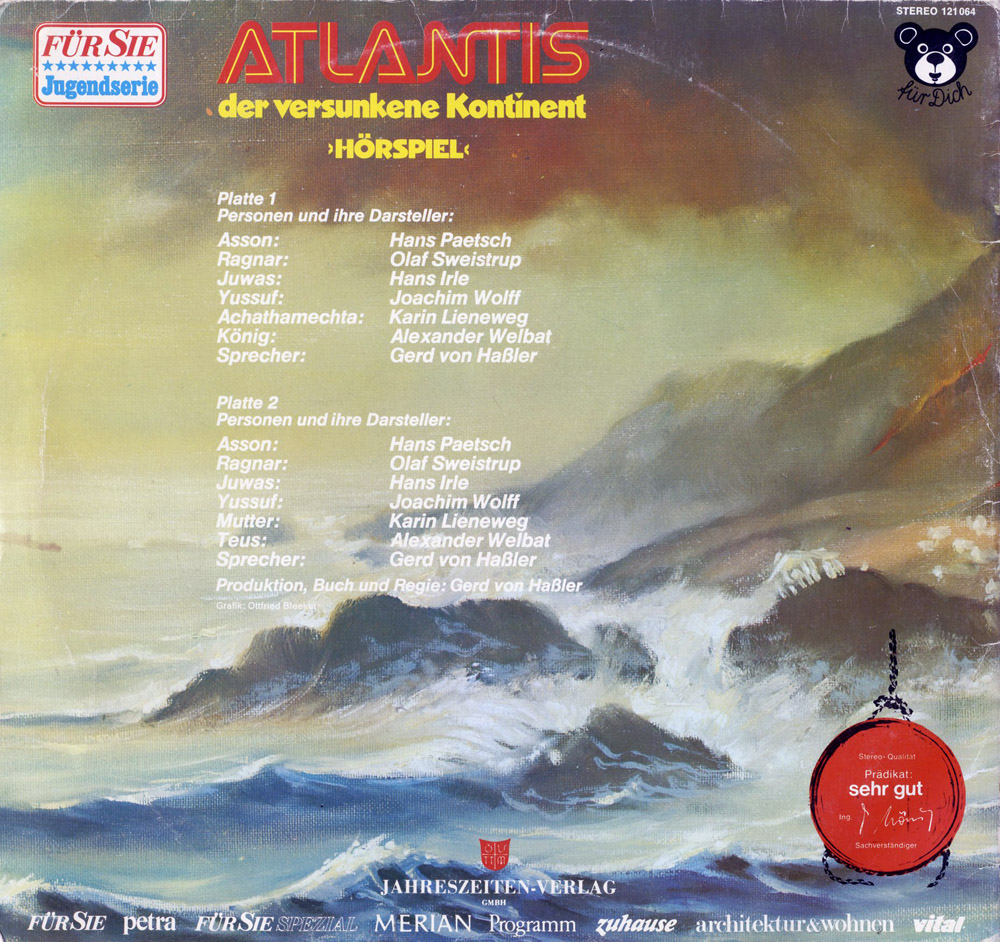 Von diesem Hörspiel gibt es auch noch eine Version von "Unsere Welt" auf Doppel-Vinyl (Mit anderem Klapp Cover und wunderschönen Zeichnungen innen/außen). Diese dauert noch ca. 30 min länger als die Maritim/ Auditon Fassung, die identisch sind. Dieses Hörspiel weist sehr rassistische Tendenzen auf, und ich habe mich, nachdem ich es wiedergefunden hatte gewundert, mit was für einem Gedankengut man als Kind zugeschüttet worden ist. Die Kinder der Götter ("ASEN"! Aha, Arier?) stehen über allem und die anderen Völker sind dafür da, den mächtigen zu dienen und ihre Kinder abzutreten. Das ganze wird dann ganz Däniken like mit irgend welchen Pseudo Bibel/Koran und was weiß ich noch "Zitaten" angereichert, damit es einen "seriösen" wissenschaftlichen Eindruck beim Hörer hinterläßt. Alles in allem sehr fragwürdig, aber spitze gemacht, mit super Sprechern (Hans Paetsch als Hauptakteur) Muß man halt nur durchschauen.