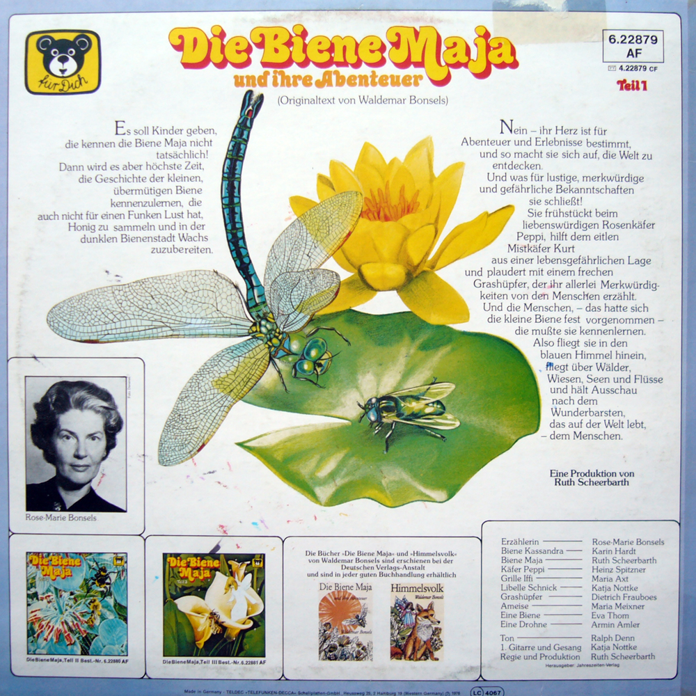 Frau Bonsels selbst hat die Rolle der Erzählerin. Ich gehe davon ausgehen, dass diese Vertonung daher inhaltlich dem Buch näher kommt als die bekannte Fernseh-Maja. Frau Bonsels macht ihre Sache als Erzählerin sehr gut. Die Sätze sind gut betont und die Sprechpausen helfen, die teilweise verschachtelten Sätze zu verstehen.