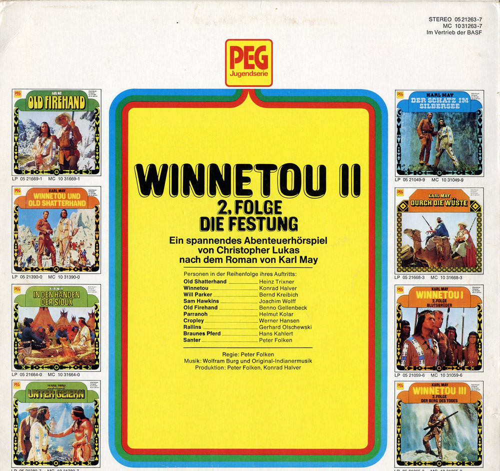 Sehr gutes Hörspiel, aber sehr kurz. Die Karl May Hörspiele von PEG sind ausführlicher als die von Europa. Nur Winnetou II: Folge 2 geht ca. eine Minute länger als die von Europa. Der Winnetouzyklus ist ziemlich identisch mit der von Europa. Ist ja das gleiche Gespann Halver und Folken.