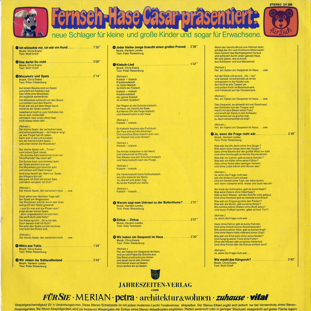 Klatsch-Lied / Warum sagt man Unkraut zu der Butterblume? / Zirkus-Zirkus / Wir haben ein Gespenst im Haus / Ja, wenn die Frage nicht wär ... / Wie macht das Känguruh?