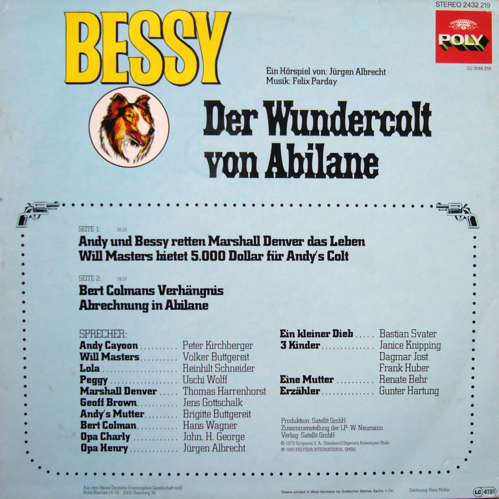 Dieser Colt ist aber ein ganz besonderes Schmückstück auf das viele ein Auge haben.Von dieser Geschenckübergabe bekommt ein Bösewicht mit und versucht den Colt von Andy abzukaufen,jedoch ohne Erfolg.Also blieb es für den Bösewicht namens Will Masters nichts anderes übrig diesen Colt von einem anderen Bösewicht stehlen zu lassen.Dieser Diebstahl wird aber schnell aufgedeckt so das es zum Schluss des Hörspiels zu einem Duell kommt zwischen Andy Cayon und Will Masters ohne das jemand zu tode kommt und Will Masters im Kittchen landet.Das ist die Story dieses Bessy Hörspiel.Die Hauptfigur Bessy wird hier wenig erwähnt.Das sind die EUROPA Fassungen von BESSY um einiges viel besser.In der EUROPA Fassung wird Bessy auch mal alleine erwähnt ohne das sie mit ihren Herrchen Andy unterwegs ist.Die Stories sind länger und besser gemacht.Bernd Kreibich als Andy Cayon gefällt mir besser als hier Peter Kirchberger.Die beiden Gauner Geff Brown und Bert Colman hören sich verstellt an.Da waren wohl keine Profisprecher am Werk. Na ja,das Beste an dieser Poly LP ist das Cover,gezeichnet von Hans Möller der auch für die Firma EUROPA jede Menge Covers gezeichnet hat.Ansonsten kann man sich dieses Hörspiel anhören.