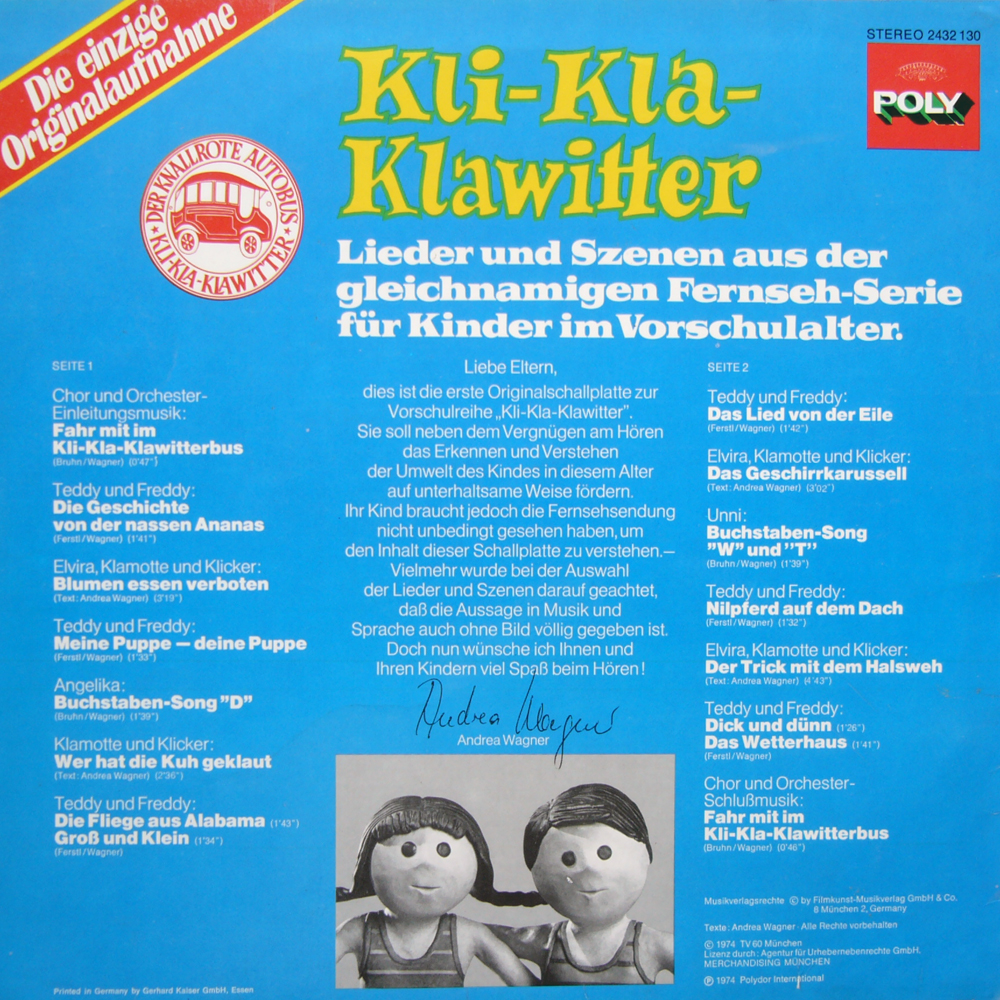 dies ist die erste Originalschallplatte zur Vorschulreihe "Kli-Kla-Klawitter". Sie soll neben dem Vergnügen am Hören das Erkennen und Verstehen der Umwelt des Kindes in diesem Alter auf unterhaltsame Weise fördern. Ihr Kind braucht jedoch die Fernsehsendung nicht unbedingt gesehen zu haben, um den Inhalt dieser Schallplatte zu verstehen. Vielmehr wurde bei der Auswahl der Lieder und Szenen darauf geachtet, daß die Aussage in Musik und Sprache auch ohne Bild völlig gegeben ist.