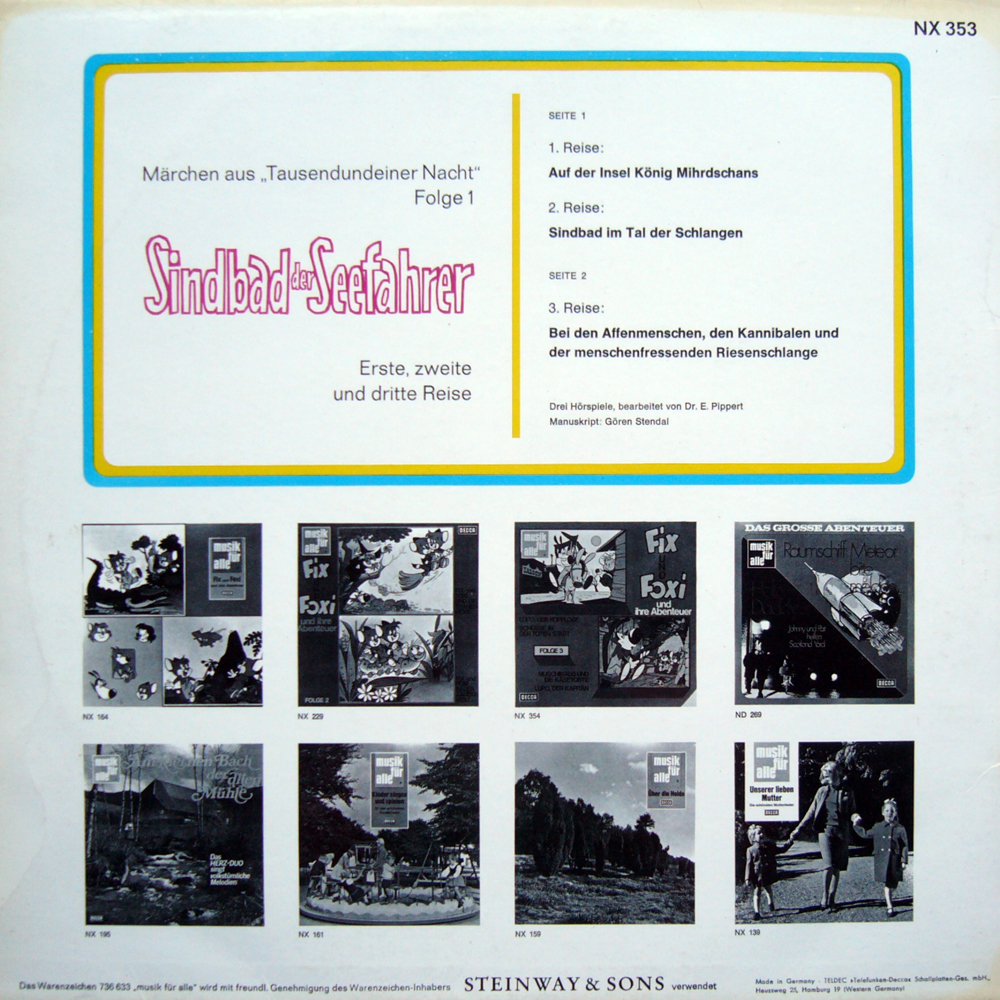 ich habe auch Sindbad-LP von Telestar (TELDEC Telefunken-Decca) mit der Nr. FT 4501, auf der auch die Reisen 1-3 drauf sind.