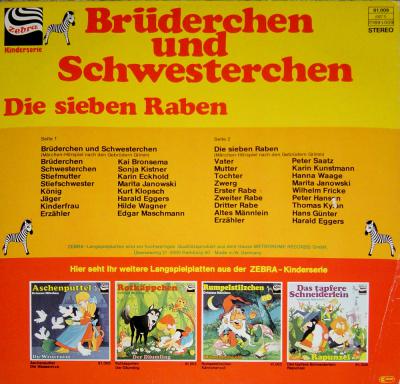 Habe dieses Hörspiel heute bekommen und meine Sammlung damit erweitert. Eine schöne Umsetzung von 'Brüderchen und Schwesterchen', jedoch kommt diese Produktion um Längen nicht an die Version aus dem Hause 'Peggy' heran. Gary Andrés und Inge Groll sind als Brüderchen und Schwesterchen einfach unschlagbar! Trotzdem bin ich froh, dass ich nun auch diese 'Zebra' Version besitze. Eine schöne LP(auch die B-Seite)!