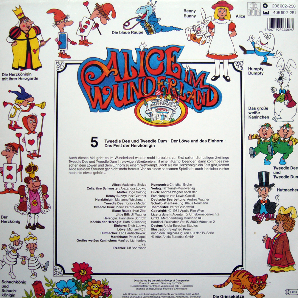 Folge 5:Tweedle Dee und Tweedle Dum-Der Löwe und das Einhorn-Das Fest der Herzkönigin :Auch dieses Mal geht es im Wunderland wieder recht turbulent zu.Erst sollen die lustigen Zwillinge Tweedle Dee und Tweedle Dum ihre ewigen Streitereien mit einem Kampf beenden,dann kommt es zwischen den Löwen und dem Einhorn zu einem Wettkampf.Doch als die Herzkönigin ein Fest gibt,kommt Alice aus dem Staunen gar nicht mehr heraus.Von so einem seltsamen Spiel habt ihr sicher vorher noch nie etwas gehört....