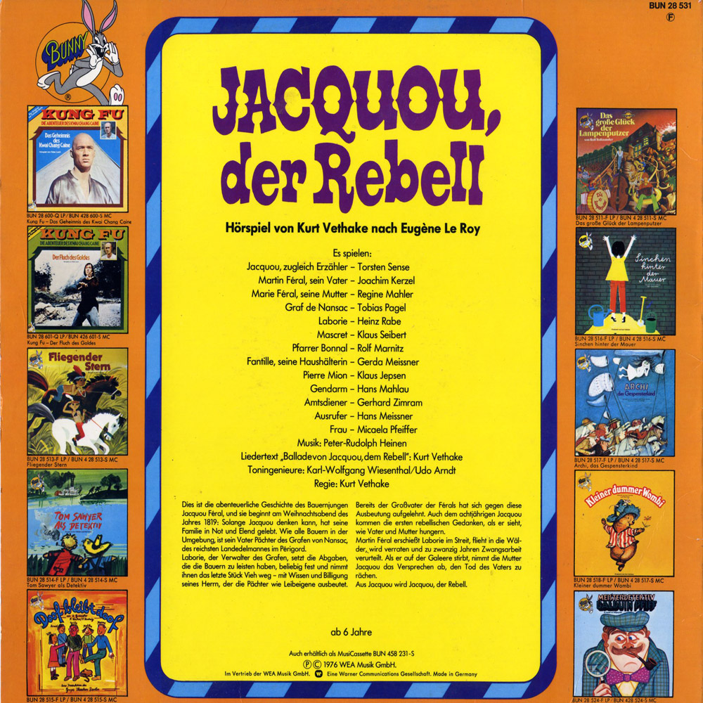 Eingetrieben wird die Pacht durch einen rauen, ungehobelten Burschen. Dieser macht sich bei den Pächtern nicht nur durch seine schlechten Mannieren unbeliebt, sondern auch dadurch, dass er recht willkürlich und zu seinen persönlichen Gunsten das durch den Grafen vertretene Recht beugt. ..., Jacqouou ´s Vater gerät mit dem brutalen Mann aneinander, als dieser aus Willkür Jacqouou ´s Hund tötet. Im Streit erschießt er den Schergen des Grafen und wird daraufhin zu 20 Jahren Zuchthaus verurteilt...