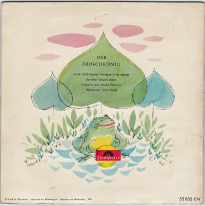 Ich habe eine alte Schellackplatte von der Firma Polydor, anstatt des sonst orange-farbenen Etiketts auf der Plattenmitte sieht man das Bild der Prinzessin mit dem Froschkönig. Die Hülle (heute: cover) ist leider nicht mehr vorhanden. Allerdings gab es doch Schellackplatten nur bis 1957 und diese ist von 1959. Auf jeden Fall ist es genau das Märchen mit genau der Musik, wie oben beschrieben.
