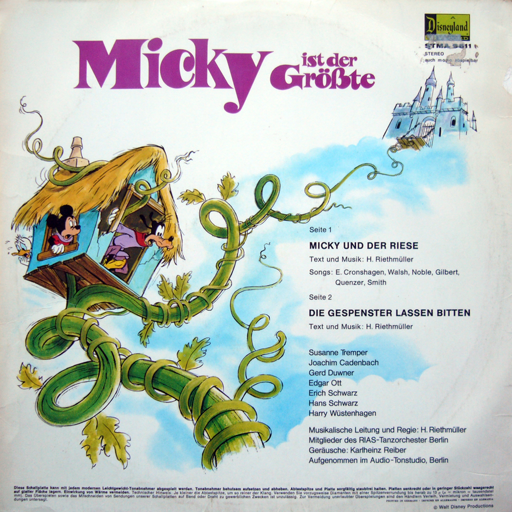 Ich habe diese Platte schon immer sehr gemocht und bin durch die A-Seite "Micky und der Riese" zum ersten Mal mit dem Märchenstoff der in den Himmel wachsenden Bohnenranke in Berührung gekommen. Die B-Seite ist eher lustig als gespenstisch, aber auch sehr schön. Besonders gut haben mir auf der ganzen Platte die Musikstücke gefallen. Micky Maus ist in diesen beiden Geschichten ein bisschen naiv dargestellt und hat auf jedenfalls nichts mit dem genialen Micky Maus der Comics gemeinsam.