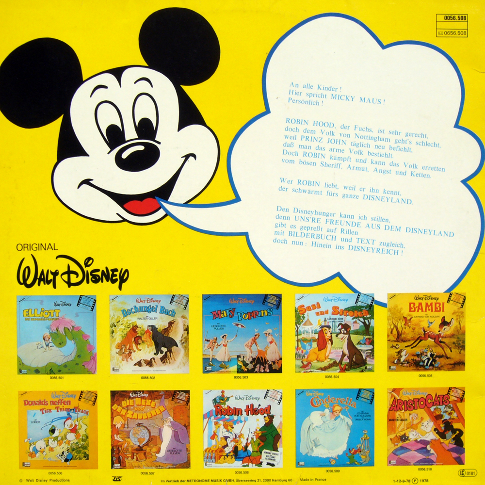 Wiederum das alte Konzept: Weitgehende, minimal unterbrochene Verwendung des deutschen Soundtracks (logischerweise mit den Originalfilmsprechern), zuzüglich ein Erzähler. Hier wurde JOACHIM PUKAß verpflichtet, ein in Berlin vielbeschäftigter Sprecher in Synchron und Rundfunk, der selbst keine Synchronrolle im Film Robin Hood hatte. Über das Flair seiner Erzählung kann man geteilter Meinung sein, ein Ersatz für Cadenbach (Dschungelbuch, Aristocats) oder Thomalla (Pinocchio, Peter Pan) ist er nicht. - Warum verdammt nicht gleich Reinhard Mey, der ohnehin den Bänkelsänger Alan van Dale spricht und singt?