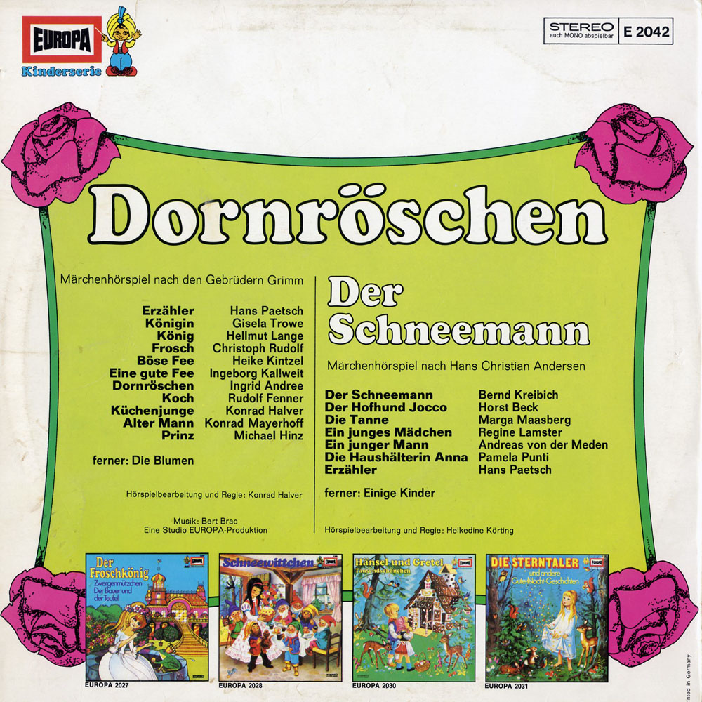 Na Dornröschen kennt wohl ziemlich jeder.Natürlich hat Europa das Märchen gut hinbekommen.Was bei dieser Platte hervorsticht ist (wieder einmal) die geniale B-Seite.