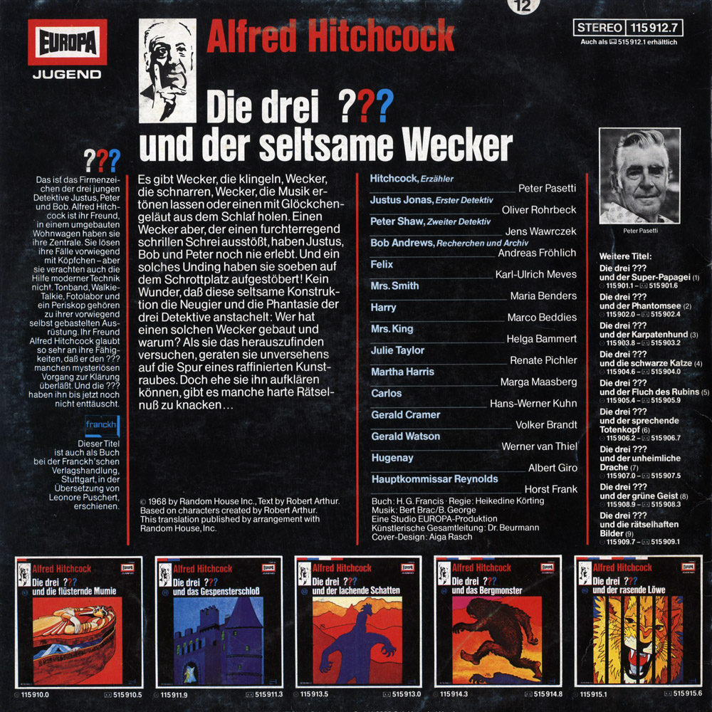 Es gibt Wecker, die klingeln, Wecker, die schnarren, Wecker, die Musik ertönen lassen oder einen mit Glöckchengeläut aus dem Schlaf holen. Einen Wecker aber, der einen furchterregend schrillen Schrei ausstößt, haben Justus, Bob und Peter noch nie erlebt. Und ein solches Unding haben sie soeben auf dem Schrottplatz aufgestöbert! Kein Wunder, dass diese seltsame Konstruktion die Neugier und die Phantasie der drei Detektive anstachelt: Wer hat einen solchen Wecker gebaut und warum? Als sie das herauszufinden versuchen, geraten sie unversehens auf die Spur eines raffinierten Kunstraubes. Doch ehe sie ihn aufklären können, gibt es manche harte Rätselnuss zu knacken...