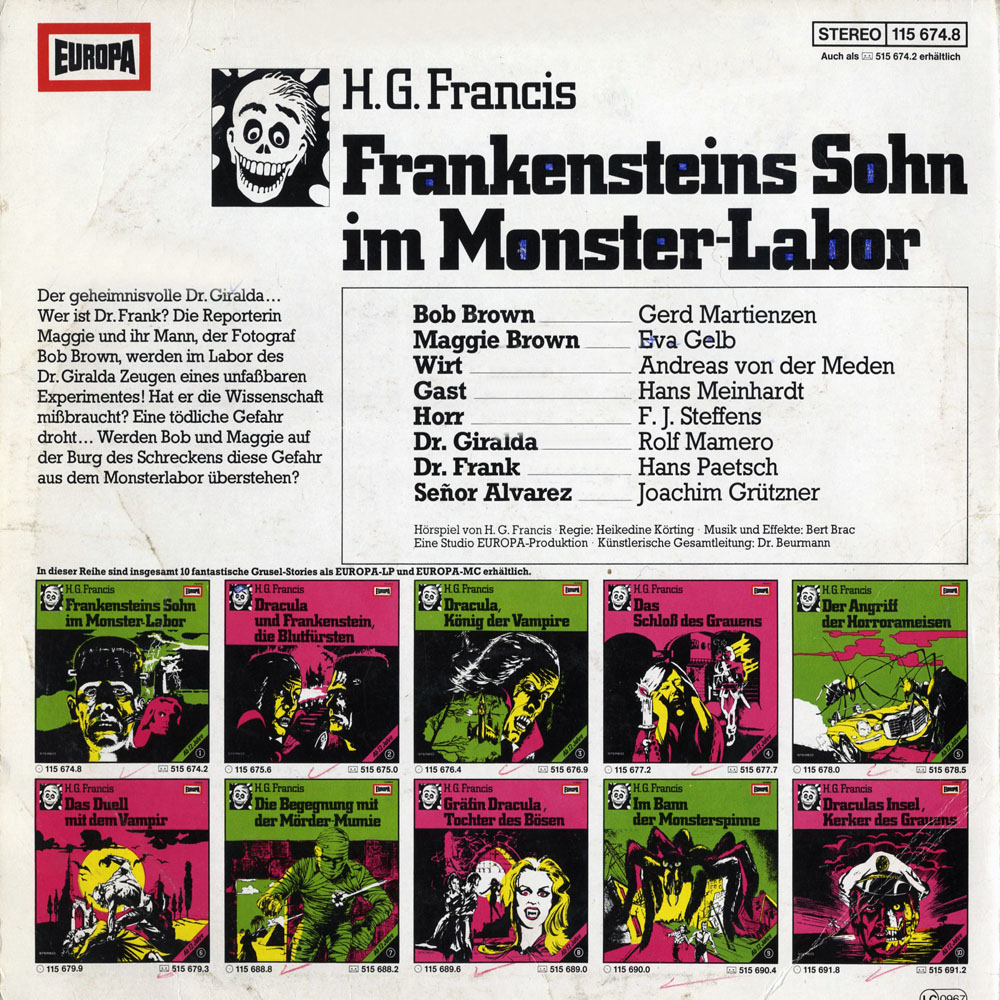 Erschien schon 1978 als Einzelhörspiel "Frankensteins Sohn". Doch auch die Ausschmückung des Titels hilft nicht darüber hinweg, dass es sich hier um eine äußerst langweilige Darbietung handelt, die nicht im mindesten gruselig ist. Hans Paetsch in seiner größten Fehlbesetzung. Bob und Maggie Brown sind nur ein schwacher Abklatsch von Eireen Fox und Tom Fawley. Nicht eine Spur Spannung will hier aufkommen. Ich rate ab.