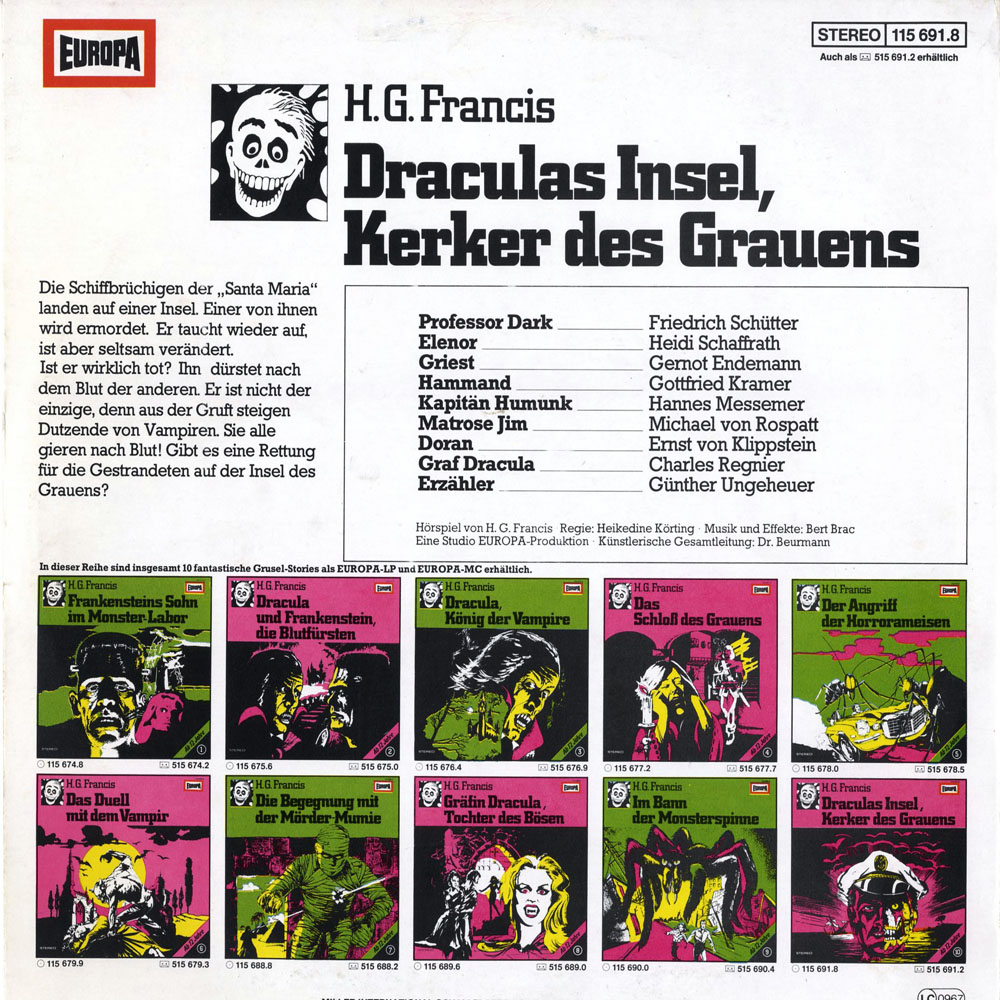 Ein gutes Hörspiel, selbst wenn Charles Regniers Dracularolle ziemlich knapp ausgefallen ist. Ansonsten prima Einfälle und originelle Dialoge, die es auch an Humor nicht missen lassen: ist schon stark, wenn der "Heldin" des Stücks als Ruheplatz eben jenes Bett angeboten wird, auf dem eben noch eine grausig verstümmelte Leiche gelegen hat, die zwischenzeitlich als Vampir wieder fit wie ein Turnschuh geworden ist. Eine Frage bleibt allerdings: Wo sollen sich diese Inseln befinden, "die der Küste von Transsilvanien vorgelagert sind", seit wann liegt Siebenbürgen am Meer? Rumänien grenzt zwar an das sogenannte Schwarze Meer, aber erstens ist das ein Binnengewässer mit wenig Möglichkeit zum Erleiden von Schiffbruch, und zweitens ist Rumänien nicht gleichbedeutend mit Transsilvanien. Liebe Kinder, die aus diesem Hörspiel gewonnen Erkenntnisse bitte NICHT beim nächsten Erdkunde-Test einfließen lassen, Onkel H.G. Francis darf Euch da kein Vorbild sein!