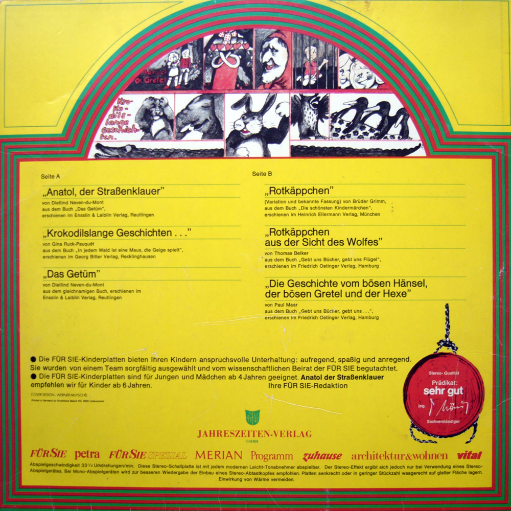 Anatol ist nicht so toll, aber ich glaube die Hänsel und Gretel-Fassung für "Jugendliche" die auch hier drauf ist stammt aus einem Buch,das unser Lehrer uns mal vorgelesen hat.Wirklich witzig gemacht,wobei viele der damals coolen Begriffe heute schon wieder altbacken wirken.Trotzdem ein tolles Hörspiel!