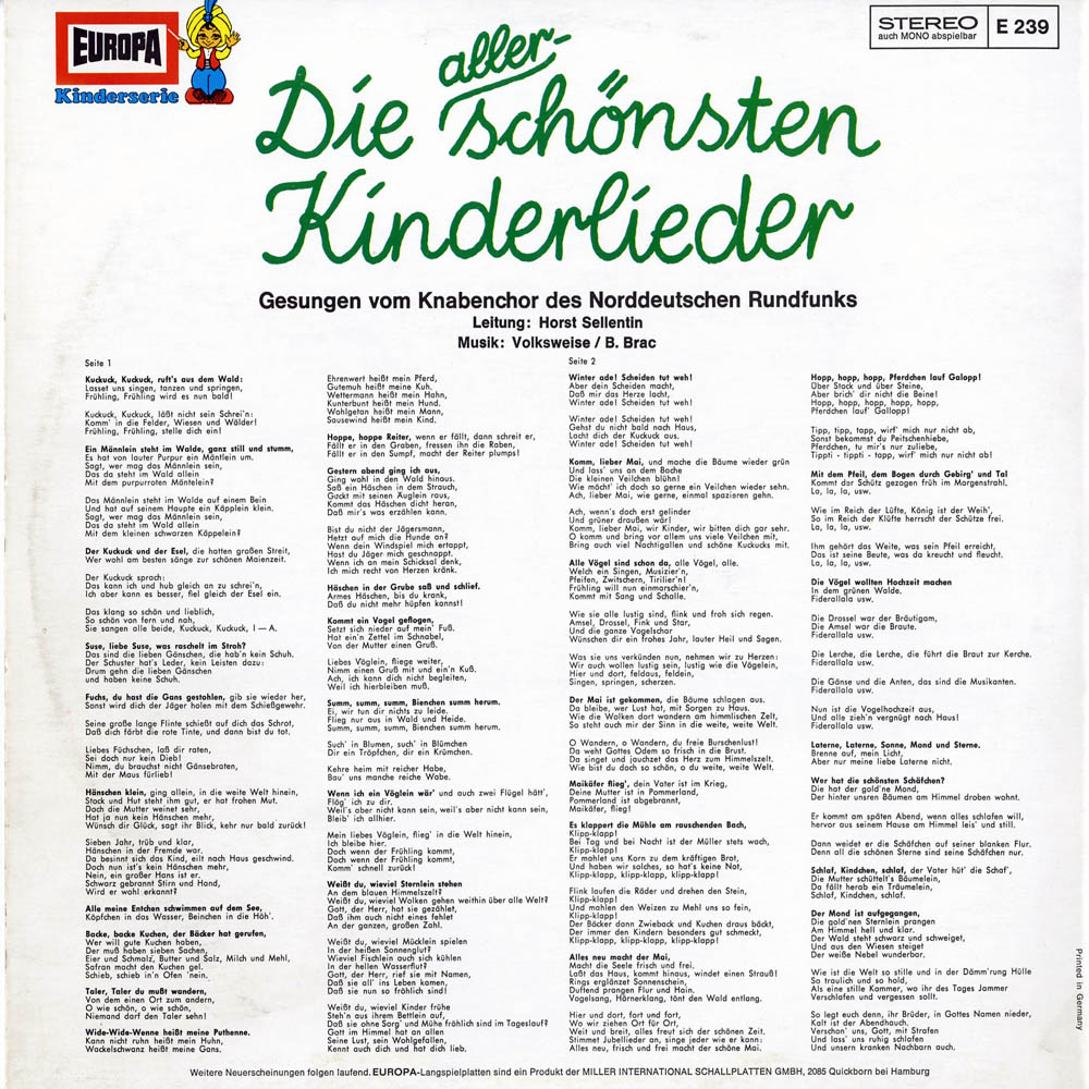 Kuckuck, Kuckuck, ruft's aus dem Wald – Ein Männlein steht im Walde – Der Kuckuck und der Esel – Suse, liebe Suse – Fuchs, du hast die Gans gestohlen – Hänschen klein – Alle meine Entchen – Backe, backe Kuchen – Taler, Taler, du mußt wandern – Wide wide wenne – Hoppe, hoppe Reiter – Gestern abend ging ich aus – Häschen in der Grube – Kommt ein Vogel geflogen – Summ, summ, summ – Wenn ich ein Vöglein wär – Weißt Du wieviel Sternlein stehen – Winter ade! – Komm, lieber Mai – Alle Vögel sind schon da – Der Mai ist gekommen – Maikäfer flieg – Es klappert die Mühle am rauschenden Bach – Alles neu macht der Mai – Hopp, hopp, hopp – Mit dem Pfeil, dem Bogen – Die Vögel wollten Hochzeit machen – Laterne, Laterne – Wer hat die schönsten Schäfchen – Schlaf, Kindchen, schlaf – Der Mond ist aufgegangen