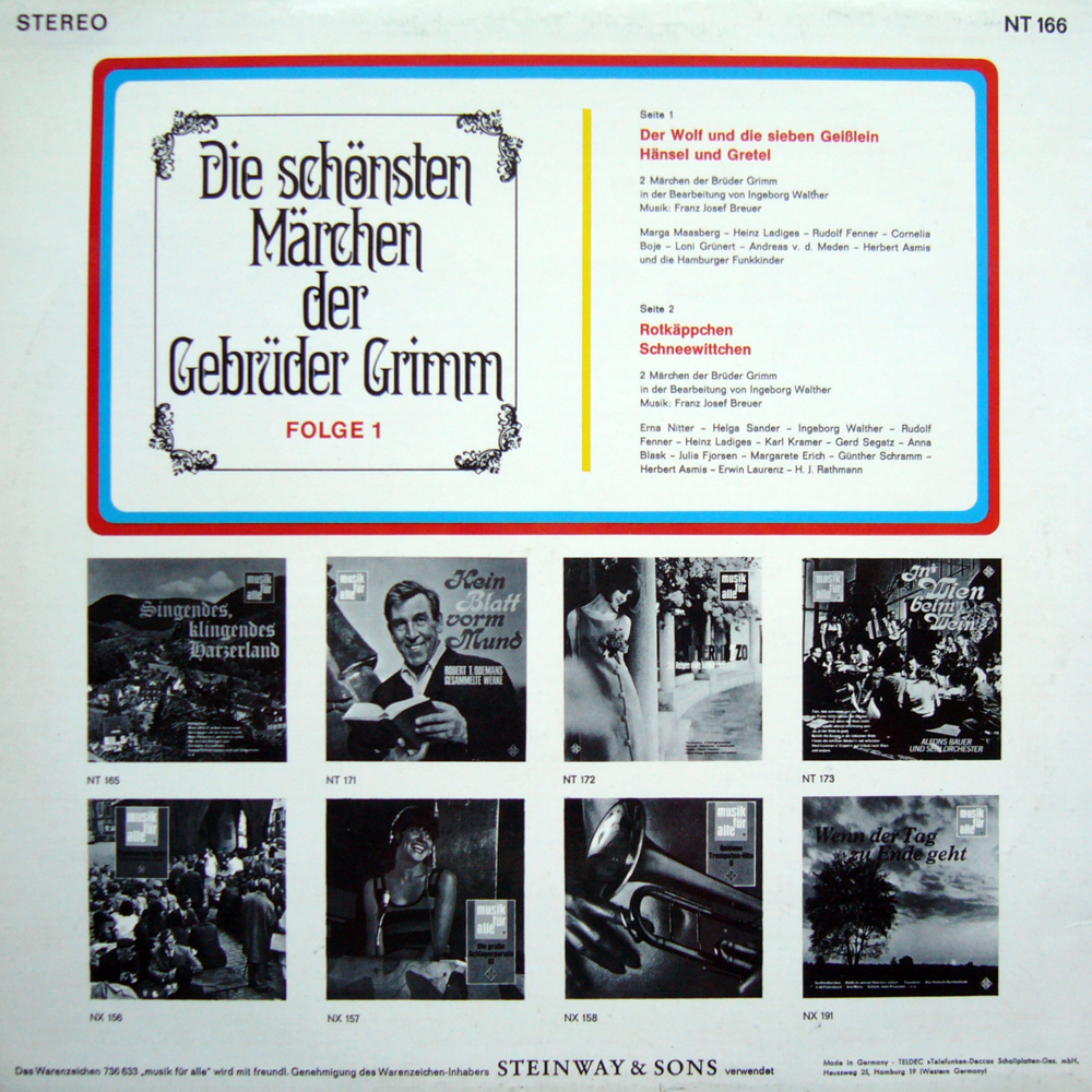 Soweit ich weiß, handelt es sich bei dieser Serie um Wiederveröffentlichungen von Märchenproduktionen aus den 50er Jahren. Telefunken hat mindestens schon seit 1954 eine Serie "Das klingende Märchenbilderbuch" produziert, damals noch auf EP, aber schon so, wie es die anderen großen Firmen auch gemacht haben: In einem Bilderbuch mit Text zum Mitlesen. Die Aufnahmen waren schon fast kleine Musicals: Jede Geschichte mit einer sehr eingängigen Leitmelodie oder mindestens einem Lied. Und auch die Besetzung konnte sich hören Lassen: Erzähler war zumeist Heinz Ladiges, der auch als Sprecher auf den ersten Telefunken-Decca-Werbeplatten "Die klingende Post" zu hören war. Vielleicht hat er auch deshalb auf diesen Werbeplatten immer so gerne auf die Märchenplatten hingewiesen. Andere Schauspieler, die an diesen Produktionen mitgewirkt haben, haben sich später bei anderen kultigen Hörspiel-Labels einen guten Namen gemacht, z. B. Benno Gellenbeck, Herbert A. E. Böhme und Horst Beck - letzterer sogar als Sänger, musste er doch in "Hans im Glück" als Hauptdarsteller mehrfach das Leitlied singen. - Diese Produktionen klingen gewiss recht altbacken, haben für den Liebhaber aber nach wie vor ihren Reiz.
