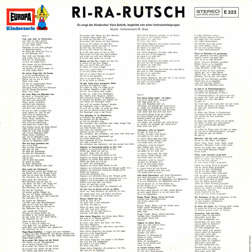 Tuck, tuck, tuck, ihr Hühnerchen – An meiner Ziege hab' ich Freude – Als unser Mops ein Möpschen war – Wer die Gans gestohlen hat – Was macht der Fuhrmann – Regen- Regentröpfchen – Ri-ra-rutsch, wir fahren mit der Kutsch' – Machet auf das Tor – Ich geh' durch einen grasgrünen Wald – Frau Schwalbe ist 'ne Schwätzerin – Vögelein im Tannenwald pfeifet so hell – Ich steh' hier im Kreise und bin so allein – Kleiner Schelm bist du – Zehn kleine Negerlein – Eine kleine Geige möcht' ich haben – Hänselein, willst du tanzen? – Jetzt danzt Hannemann – Ringel, ringel, rosen – Vöglein im hohen Baum – In meinem kleinen Apfel – Ward ein Blümchen mir geschenket – So geht es im Schnützelputzhäus'l – Mäuschen, laß dich nicht erwischen – Wulle, wulle Gänschen – Der Sandmann ist da – Es tönen die Lieder – Himmelsau, licht und blau