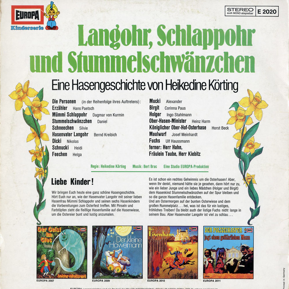 Hört Euch nur an, wie der Hasenvater Langohr mit seiner lieben Hasenfrau Mümmi Schlappohr und seinen sechs Hasenkindern die Vorbereitungen zum Osterfest treffen. Mit Pinseln und Farbtöpfen zieht die fleißige Hasenfamilie auf die Hasenwiese, um die Ostereier bunt und lustig anzumalen.