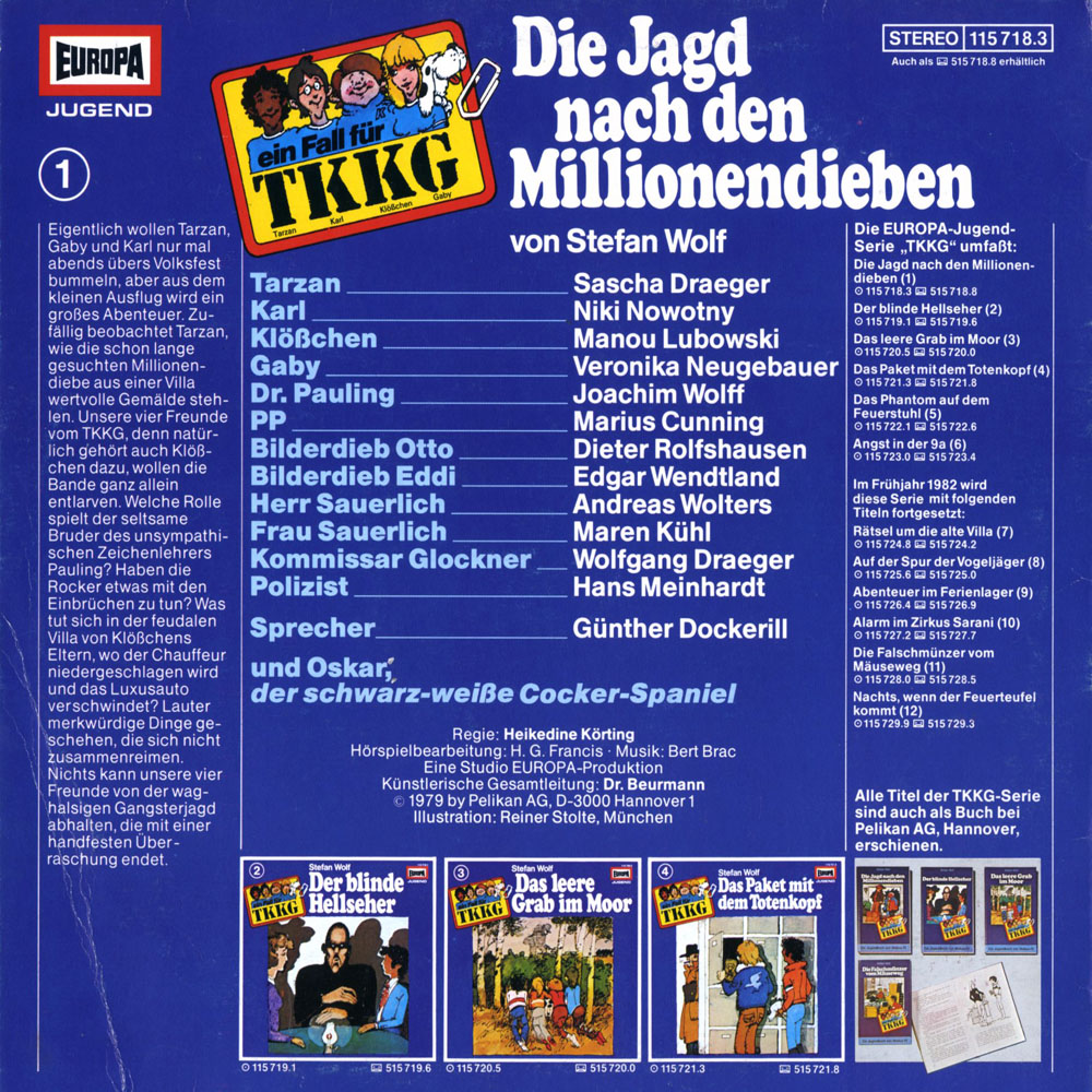 Eigentlich wollen Tarzan, Gaby und Karl nur mal abends übers Volksfest bummeln, aber aus dem kleinen Ausflug wird ein großes Abenteuer. Zufällig beobachtet Tarzan, wie die schon lange gesuchten Millionendiebe aus einer Villa wertvolle Gemälde stehlen. Unsere vier Freunde von TKKG, denn natürlich gehört auch Klößchen dazu, wollen die Bande ganz allein entlarven. Welche Rolle spielt der seltsame Bruder des unsympathischen Zeichenlehrers Pauling? Haben die Rocker etwas mit den Einbrüchen zu tun? Was tut sich in der feudalen Villa von Klößchens Eltern, wo der Chauffeur niedergeschlagen wird und das Luxusauto verschwindet? Lauter merkwürdige Dinge geschehen, die sich nicht zusammenreimen. Nichts kann unsere vier Freunde von der waghalsigen Gangsterjagd abhalten, die mit einer handfesten Überraschung endet