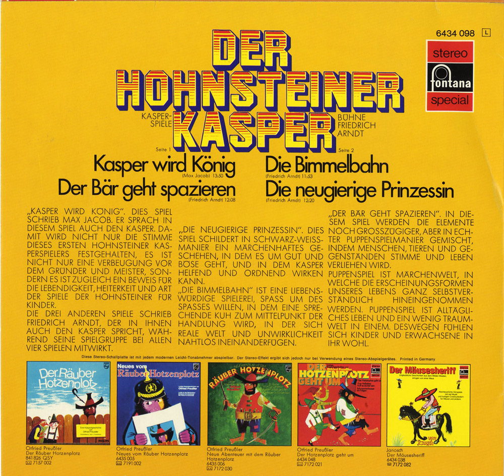 Diese Single und andere Hohnsteiner habe ich in den 60ern regelmäßig von meiner Patentante geschenkt bekommen. Meine Mutter ist heute noch (nach ca. 40 Jahren!) traumatisiert von "Tri tra tralala", das aus meinem Plattenspieler (so einer mit Lautsprecher im Deckel) die Wohnung mit tausend Dezibel terrorisierte. Ich fand die Platten klasse.