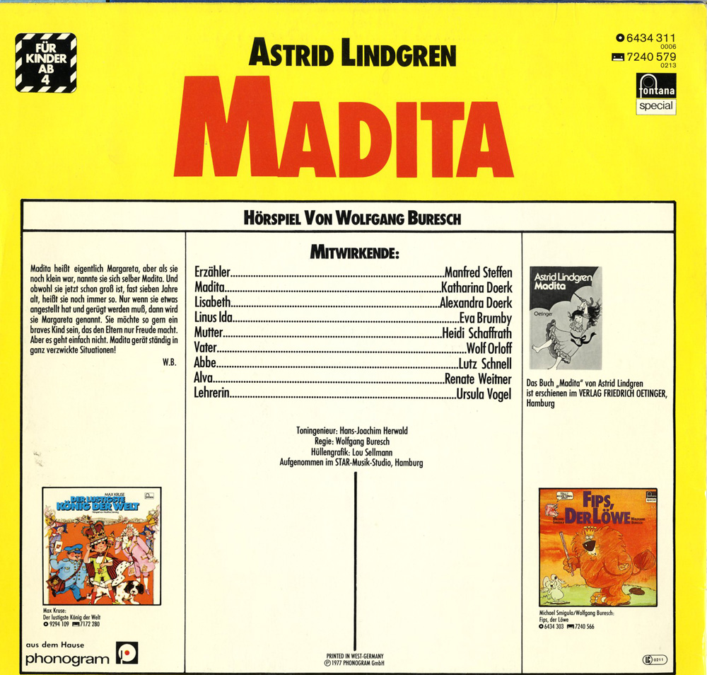 Der Altmeister der Kinderunterhaltung Wolfgang Buresch (Hase Cäsar, Emm wie Meikel u.v.a.) hat dieses Hörspiel geschrieben (nach dem Buch von Astrid Lindgren), Regie geführt und den Vater gesprochen (unter dem Pseudonym Wolf Orloff). Und es ist ihm wunderbar gelungen! An den lustigen Erlebnissen der kleinen Madita und ihrer noch kleineren Schwester Lisabeth (passenderweise von den Schwestern Doerk gesprochen) am Rande einer kleinen idyllischen Stadt in Schweden kann man auch als erwachsener Hörer Gefallen finden. Ganz besonders gut ist Manfred Steffen als Erzähler.