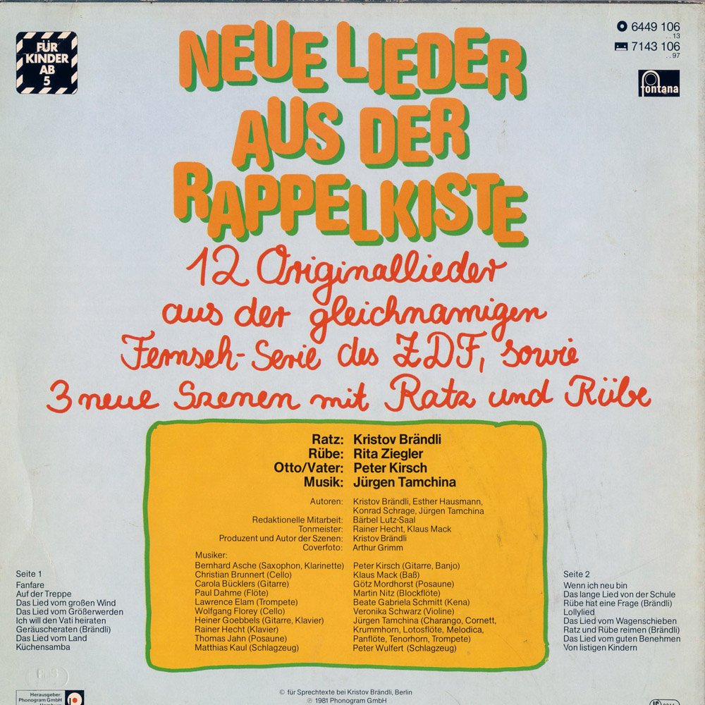 12 Originallieder aus der gleichnamigen Fernsehserie des ZDF sowie drei neue Szenen mit Ratz und Rübe Produzent und Autor der Szenen: Kristov Brändli Musik: Jürgen Tamchina