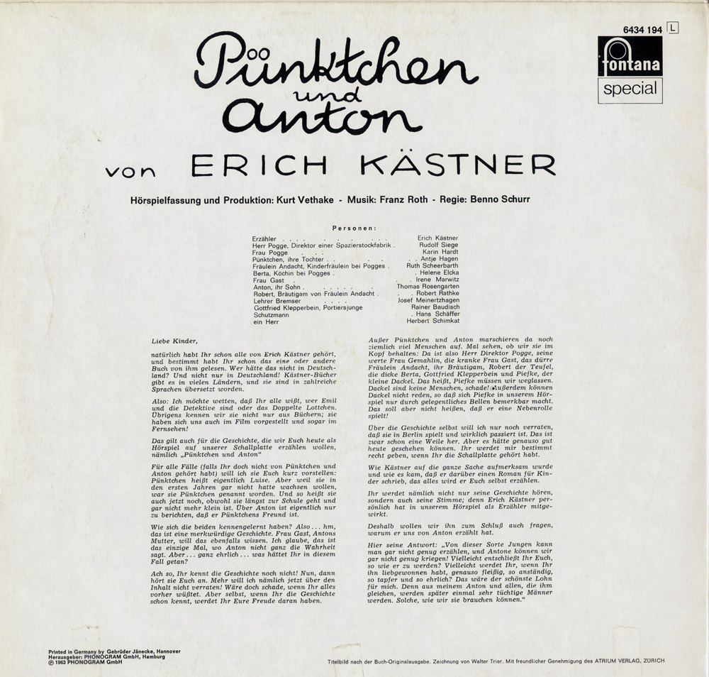 Eine zeitlos wunderbare Aufnahme von 1963 unter der Regie von Kurt Vethake mit Erich Kästner persönlich als Erzähler. Gibt´s heute noch immer im Handel (inzwischen beim Label Deutsche Grammophon). Da wird die Stimmung im alten Berlin lebendig, und die Dialoge sind - wie immer bei Kästner - erstklassig!