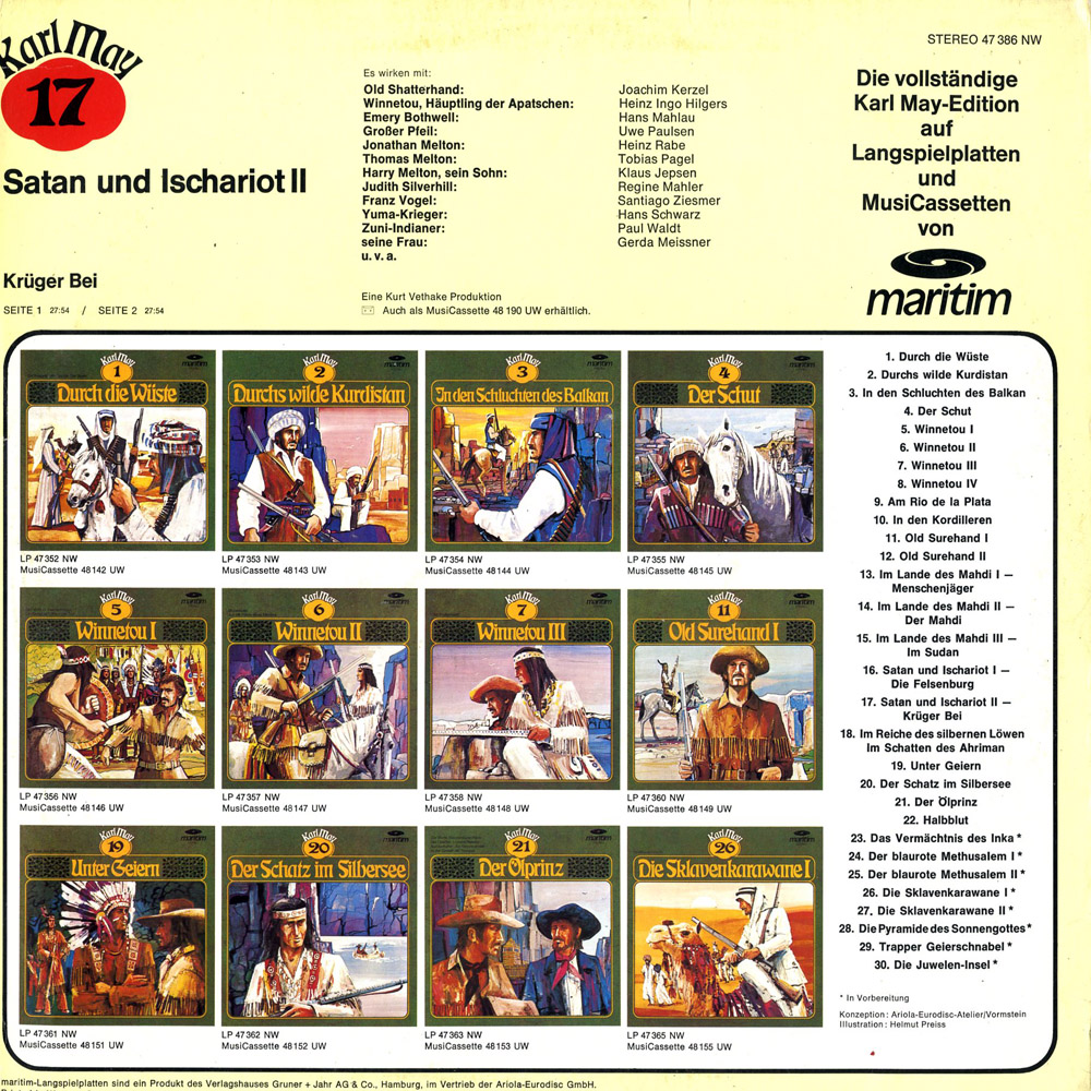 Titelbild: Helmut Preiss. Vorlage: 'Satan und Ischariot III' [Die Jagd auf den Millionendieb] [Der Untertitel 'Krüger Bei' ist irreführend, weil dieser Band hier nicht adaptiert wurde] Anmerkung: Produktionszwilling von 'Satan und Ischariot I'. Das Titelbild zeigt eine orientalische Szene, obwohl das gesamte Hörspiel vollständig in Nordamerikas spielt.