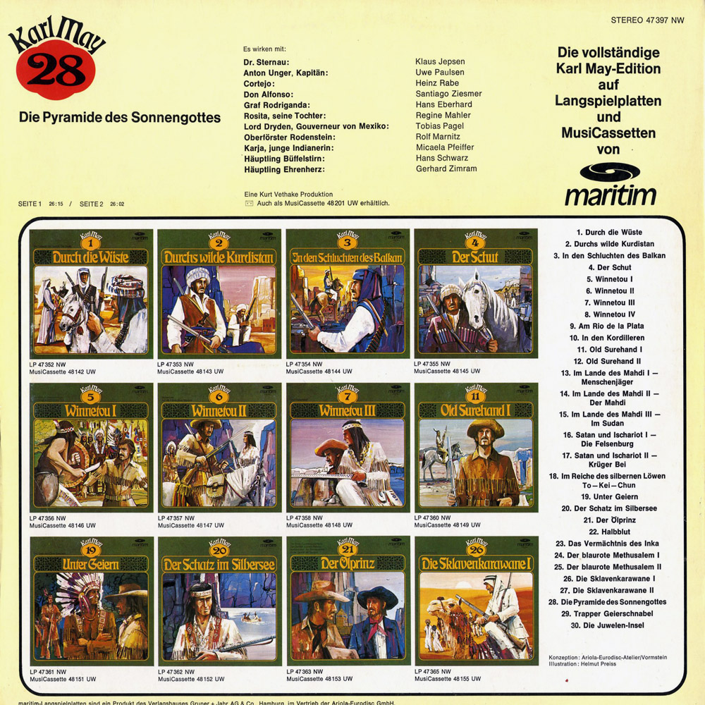 Produktionsdaten: Titelbild: Helmut Preiss. Vorlage: 'Die Pyramide des Sonnengottes' aus dem Waldröschen-Romanzyklus [Folgt der Fassung des Karl-May-Verlages] Anmerkung: Produktionszwilling von 'Trapper Geierschnabel'.