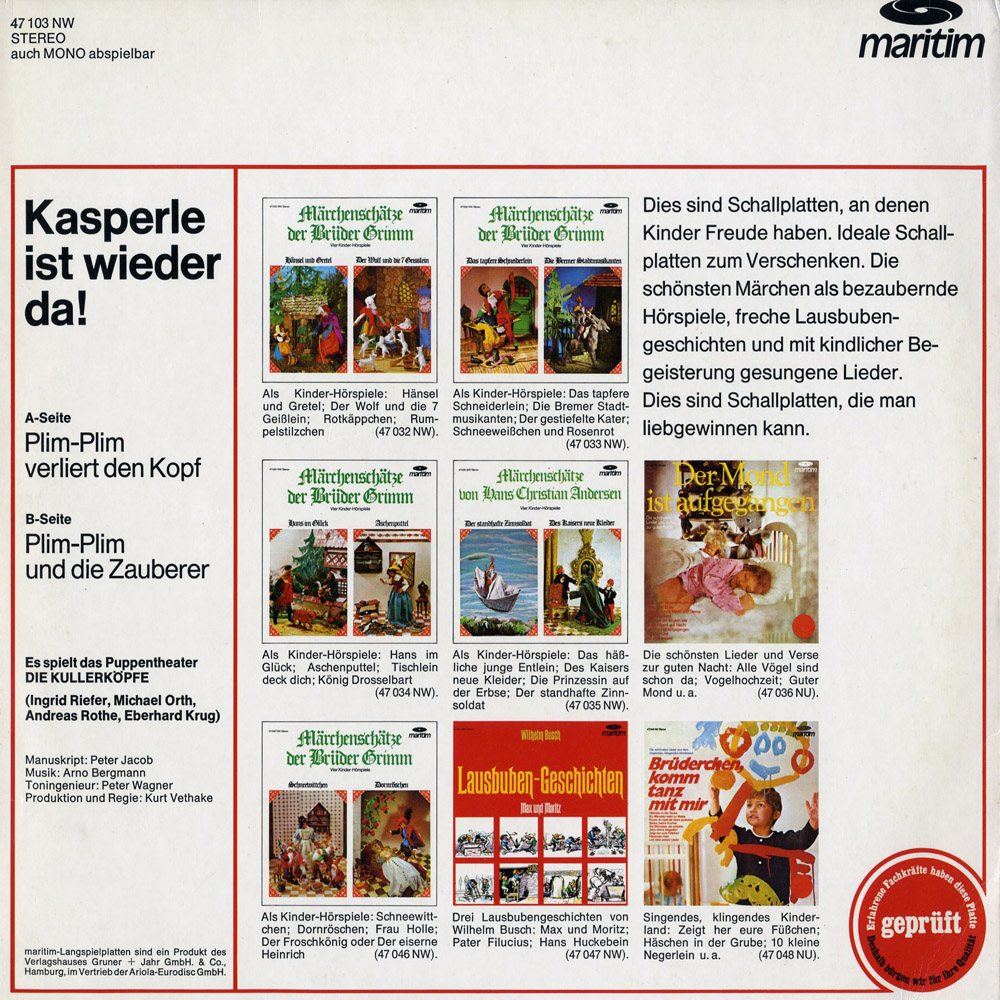 Ja, kann ich bestätigen, es gab sie wirklich, diese Berliner Puppenbühne mit ihrem (leider verstorbenen) Prinzipal, dem genialen Michael Orth. Viele Hörspiele gehen auf sein Konto, neben dieser Kasperplatte u.a. noch "Das Mondkind", "Der Clown im Apfelbaum", "Ein Riese im Fernsehen", "Hase und Igel", "Der Teufel mit den drei goldenen Haaren", "Die Burg der fröhlichen Gespenster" und und und ...