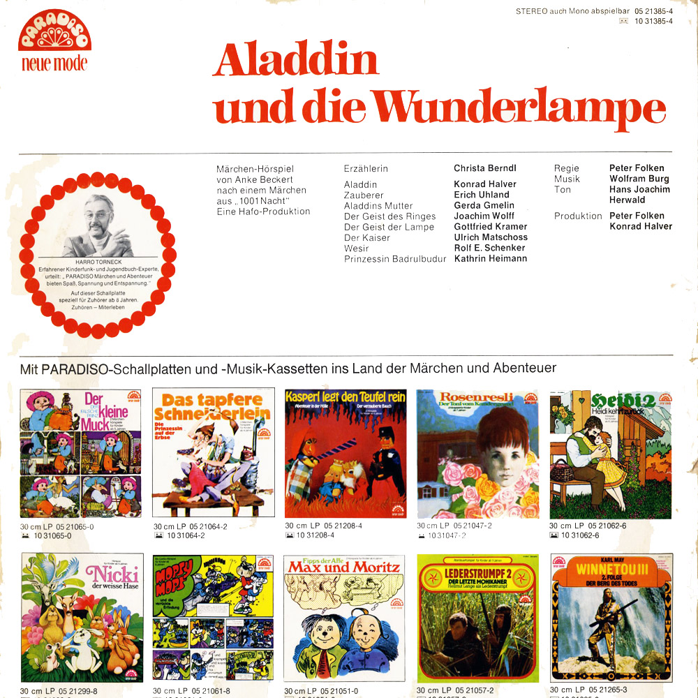 Ich stimme zu, dass das ein schönes HSP ist. Die Geschichte wird sicherlich ausführlicher erzählt als bei EUROPA, wo ihr nur eine LP-Seite eingeräumt wurde. Gerda Gmelin ist als Aladins Mutter sehr gut, ebenso Joachim Wolff als 'kleiner Geist'. Ich hatte die Peggy-Ausgabe mit einem anderen Cover, auf dem Aladin und der Lampengeist zu sehen sind. Kleines Manko: Die Aufnahme ist zeitweilig zu leise geraten, so dass man Mühe hat, den Dialog zu verstehen